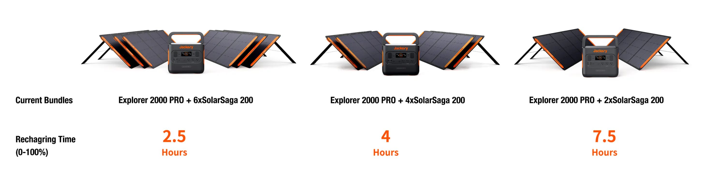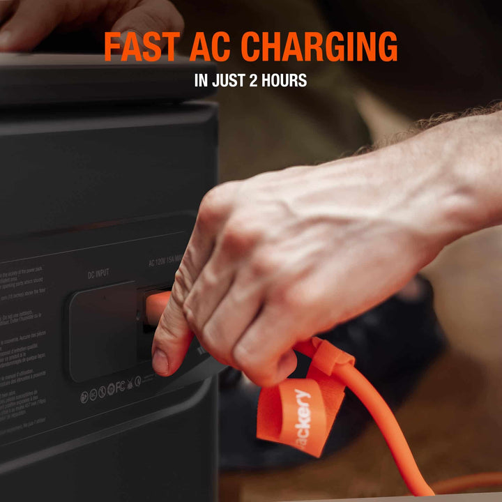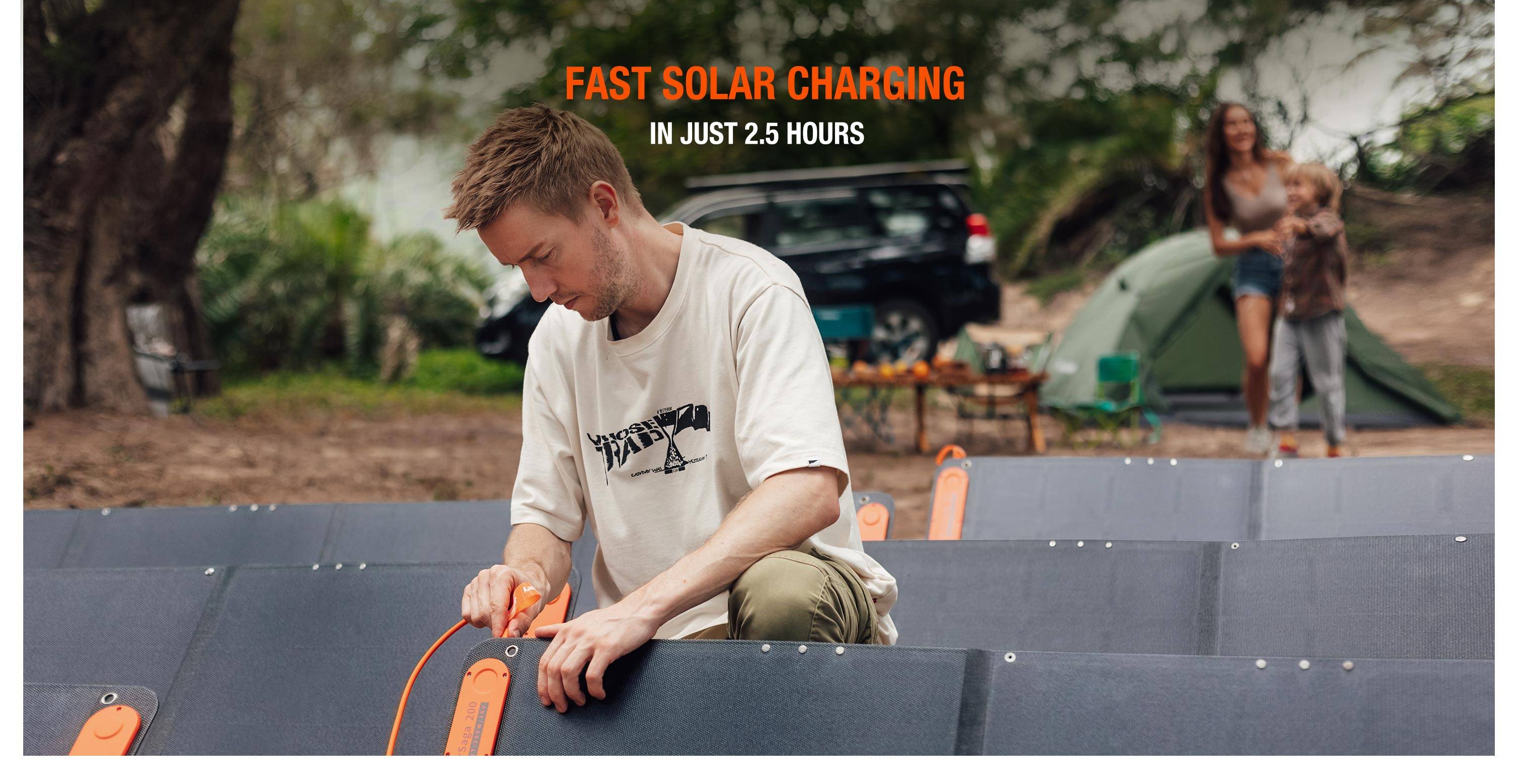 - The power station can be fully charged with 6 SolarSaga 200W solar panels in only under 2.5 hours, and in just 2 hours via AC wall outlet. Moreover, it can also be charged through car port. This fantastic charging experience allows you to charge away in no time while off the grid.