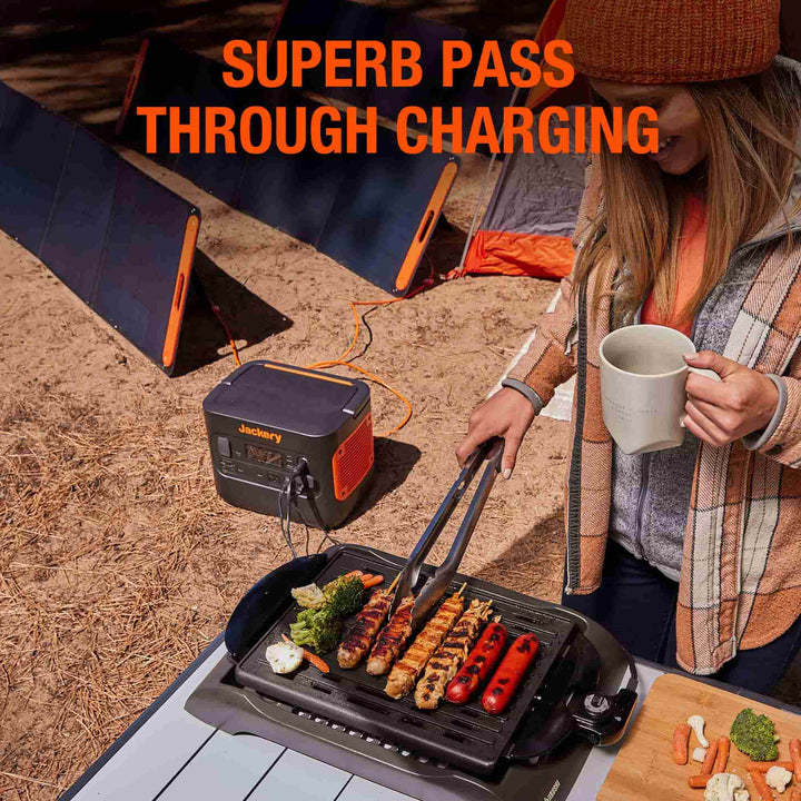 - The portable power station supports pass-through charging. This allows you to charge your power station, with essential devices still plugged in, meaning you can charge on the go quickly and conveniently.