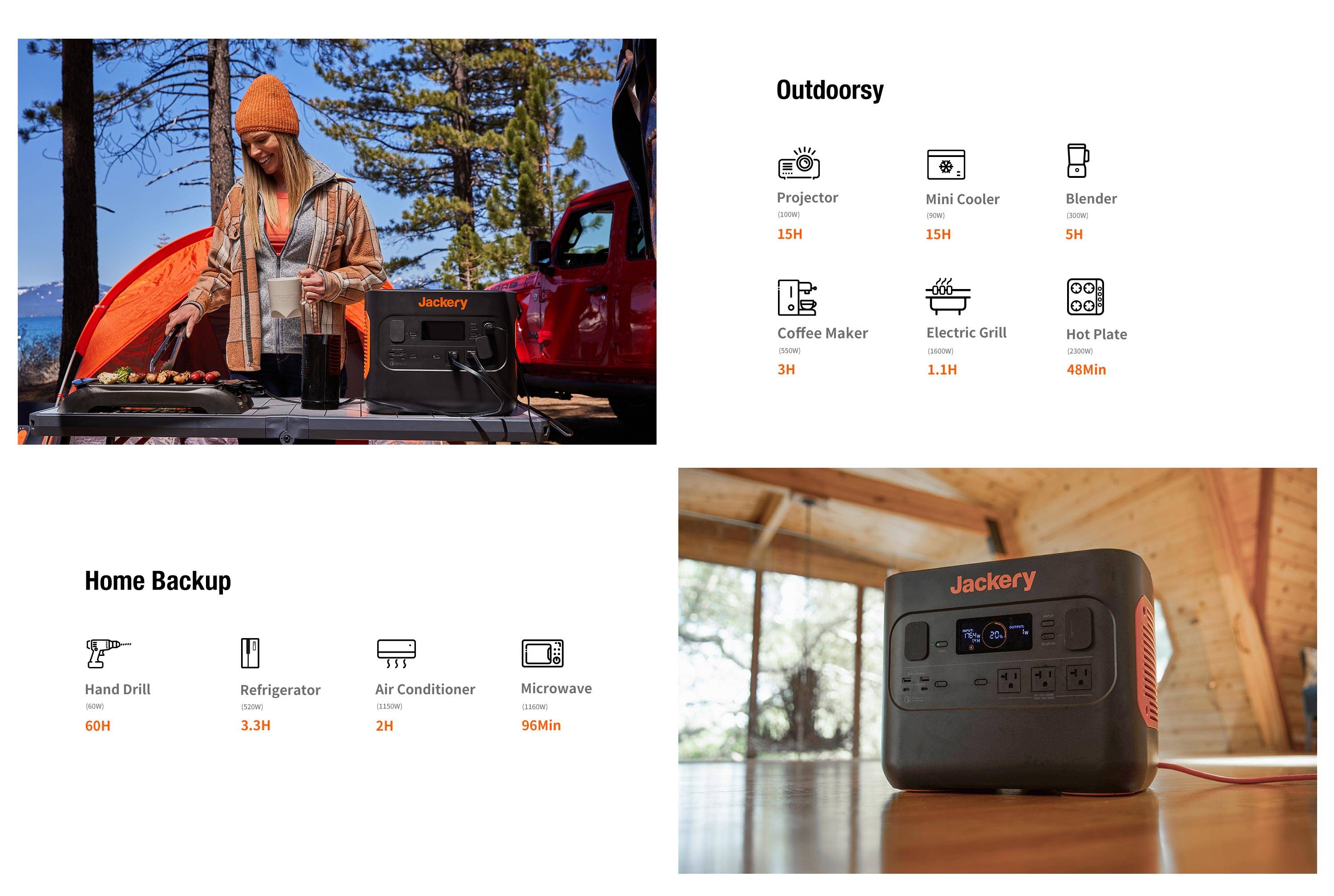 - At 2,160 Wh capacity, 2,200W AC power and 4,400W peak power, the Solar Generator 2000 Pro delivers the fastest solar recharging yet for Jackery. Powering majority of appliances and tools for outdoor activities and home emergency use - pellet smokers, mini coolers, ebikes, refrigerators, air conditioners and more.