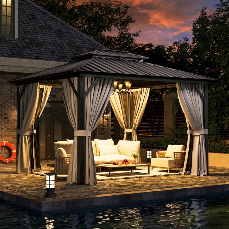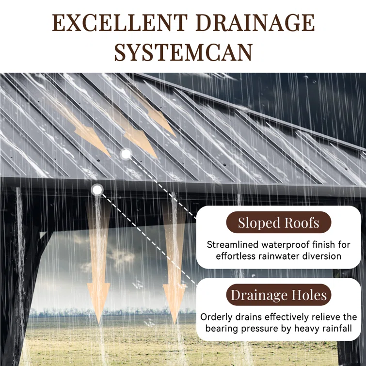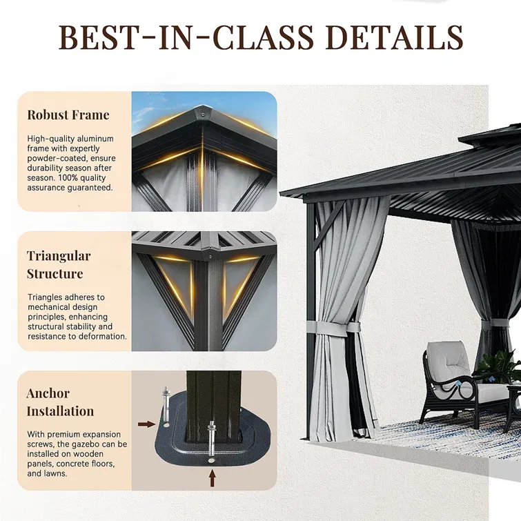 - Vented Double Hardtop: Compared to a single-layer design, this double gazebo canopy allows sunlight to filter through and provides excellent airflow. The galvanized steel metal top can withstand heavy snow, ensuring privacy, safety, and a cool room.