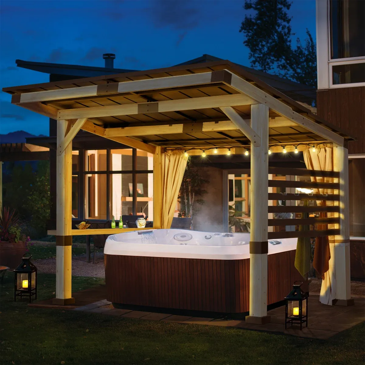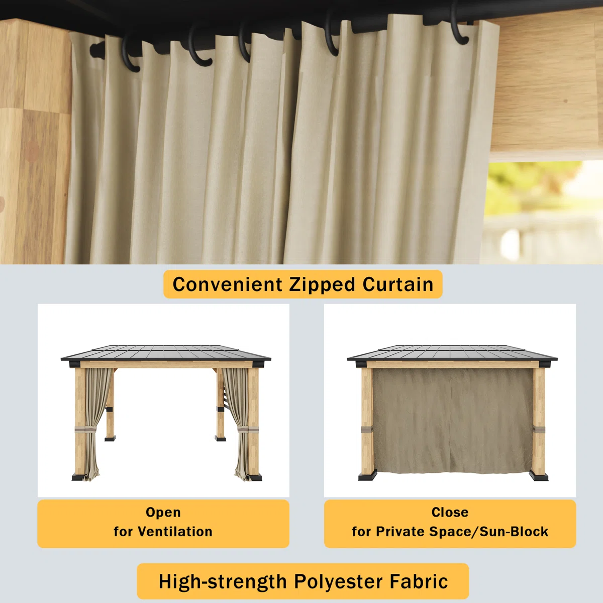 - Privacy curtain: This outdoor gazebo is equipped with a curtain on one side, zip closure, using high strength polyester fabric, which protects your privacy and protects you from the hot sun, you can also place a jacuzzi inside the gazebo and enjoy the sauna.