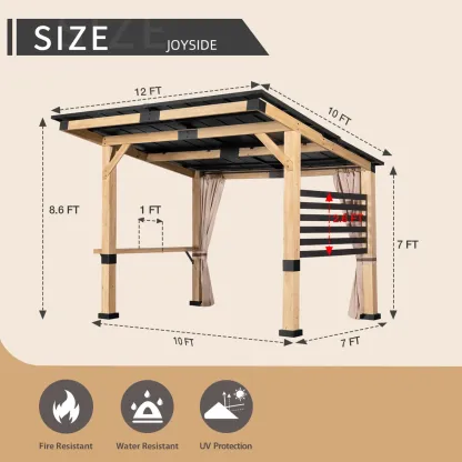 Bring the glamour and comfort of a resort experience into your everyday life. This hard top wooden outdoor gazebo is the perfect item to add elegance and ease to your deck or patio. The sloping galvanised steel roof is strong and durable and prevents rainwater from collecting. Equipped with hooks and shelves to keep your belongings tidy, the classic design blends well with many styles of patio furniture. This item is built for stability to withstand all types of weather and with good ventilation and a UV resistant top, this wooden gazebo would make a great barbecue pavilion! With simple, easy to follow assembly instructions, you'll be relaxing with your favourite drink in your new favourite outdoor space for years to come.