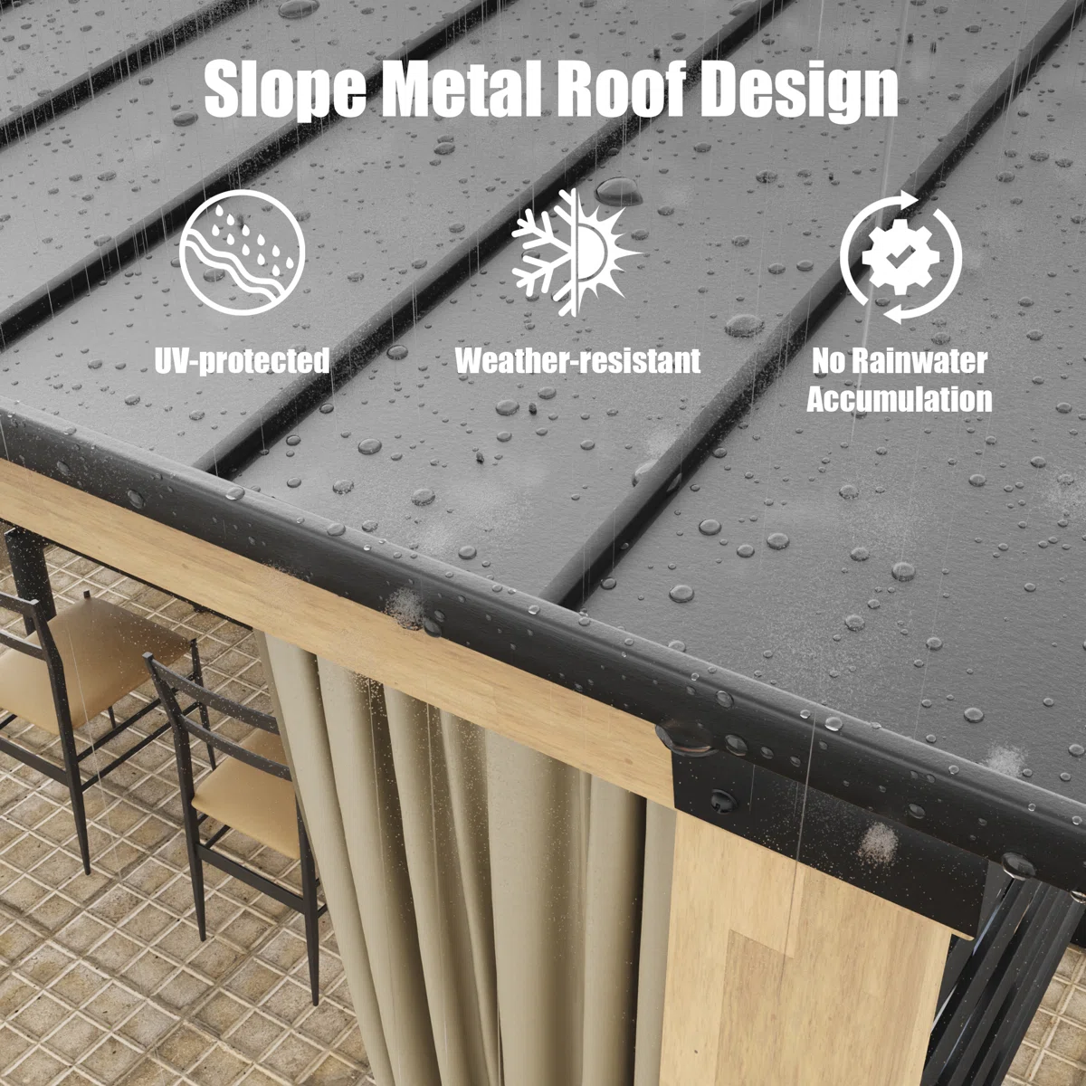- Sloping roof design: Our metal top gazebo is designed with a sloped roof for good drainage, while the galvanised steel roof prevents rust and sunlight while increasing load bearing. This gazebo is versatile for all seasons, fearless of rain, snow and wind.