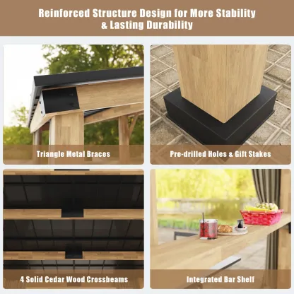 - Strong and stable: The entire frame structure of this is patio gazebo is made of solid cedar wood, all of which is coated with a special paint to ensure long lasting durability and prevent mould and rot. Four solid wood beams attached to the two front posts and triangular metal brackets increase the maximum weight capacity (100 lbs/sq ft), and the four square posts can be secured with our free pre-drilled anchors for added stability.
