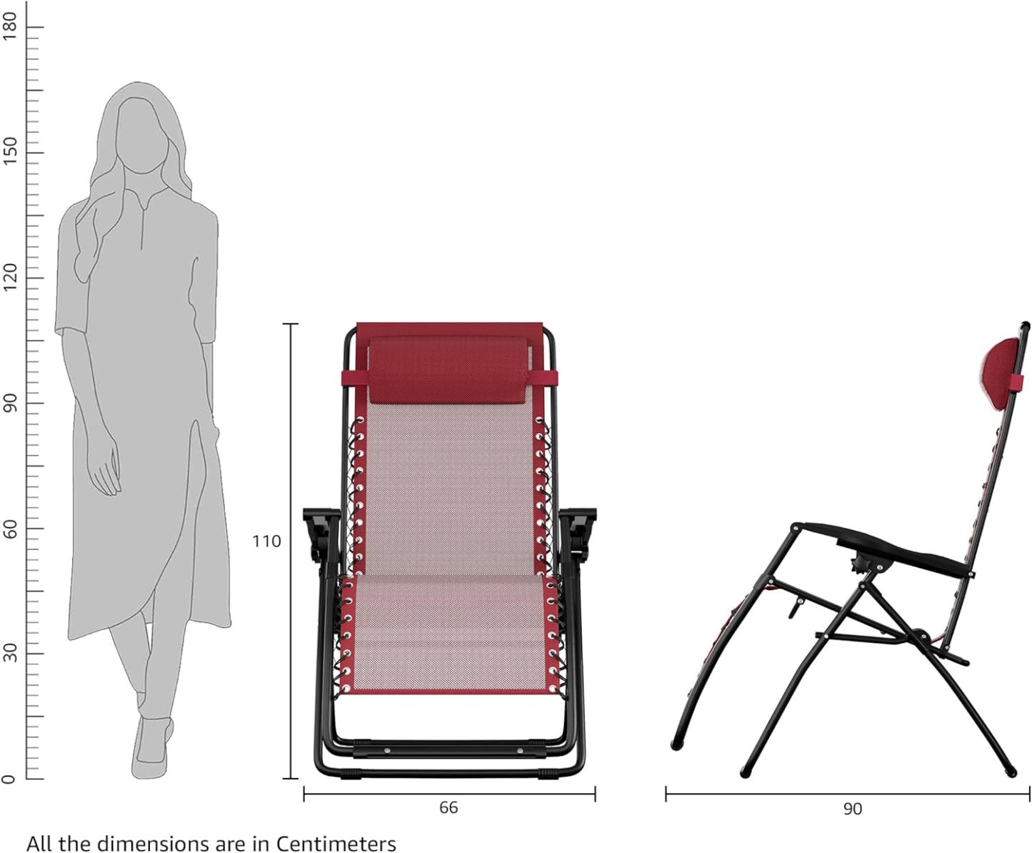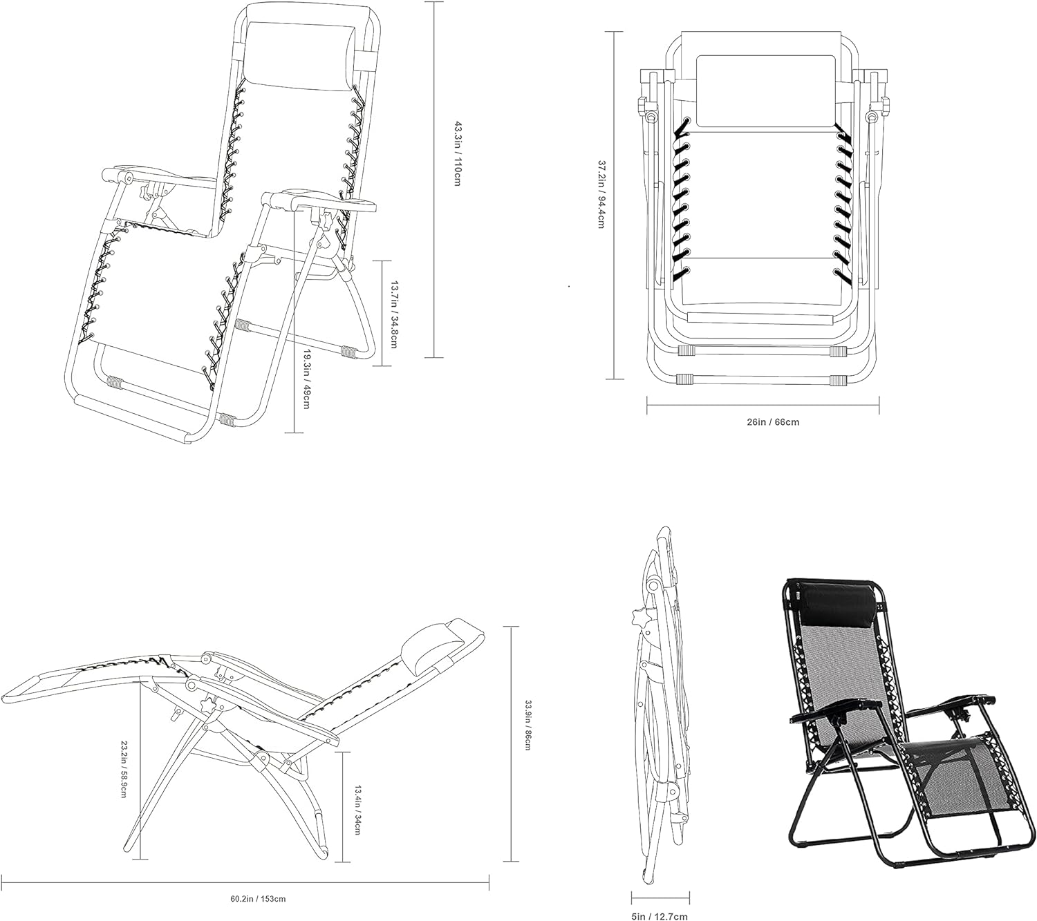 300-pound weight capacity; upright dimensions: 26 x 43.3 inches (WxH), 13.7 inches (from floor to seat), and 19.3 inches (from floor to armrest); reclined dimensions: 60.2 x 33.9 (LxH), 13.4 inches (floor to seat), and 23.3 inches (floor to leg rest)