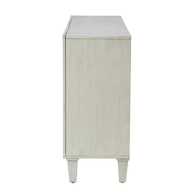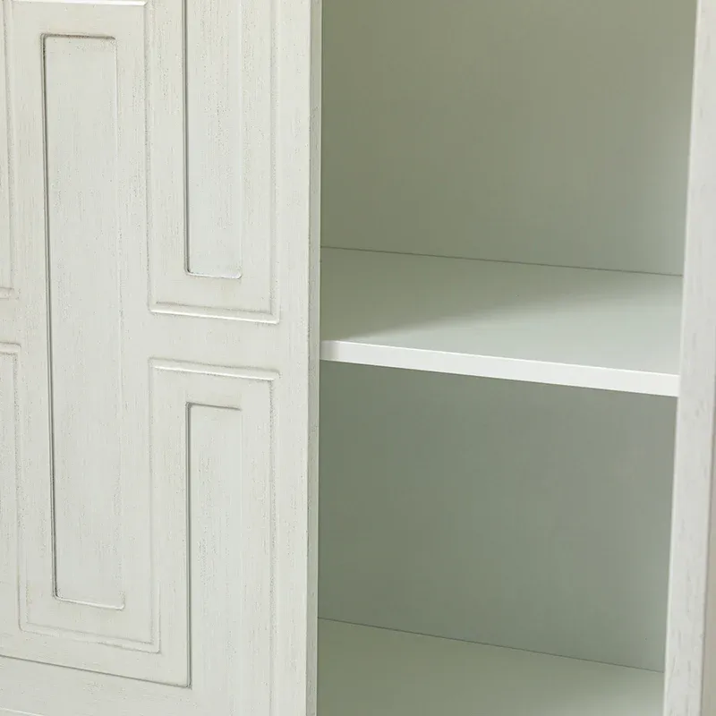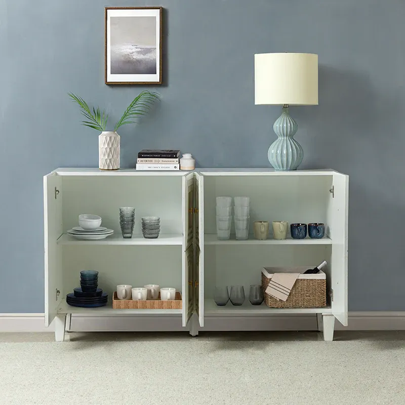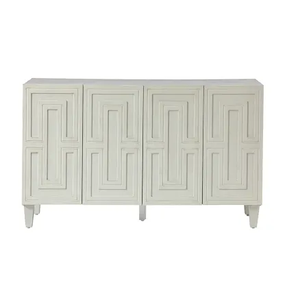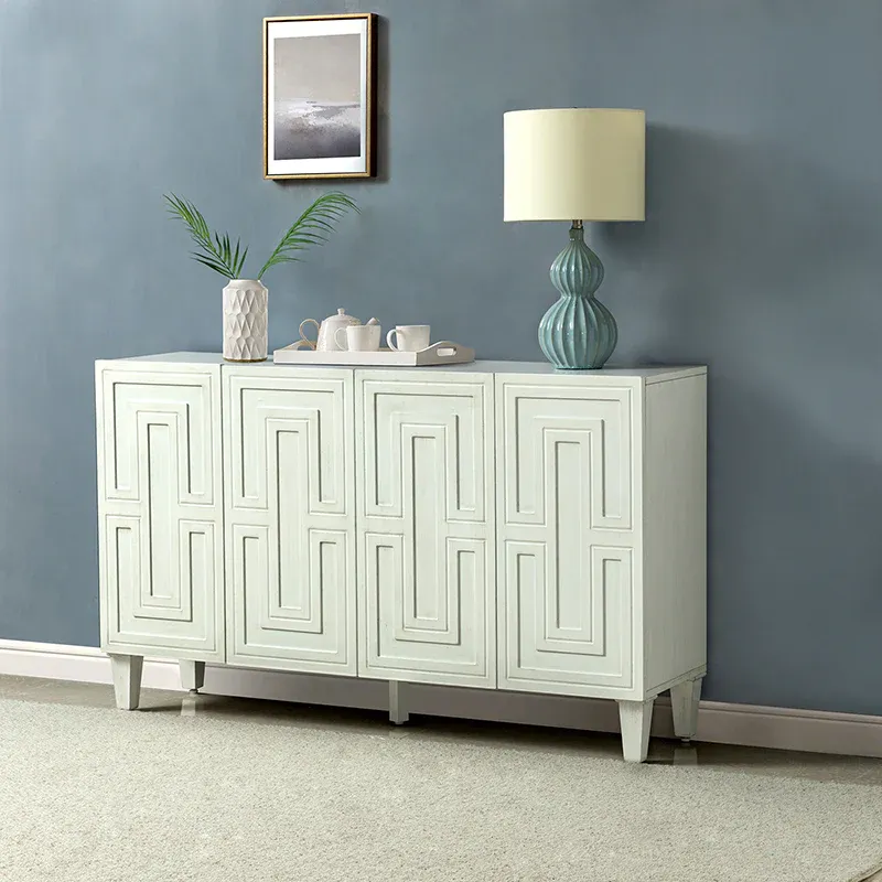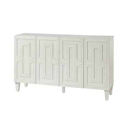 Looking to add an extra storage space that will add to your style? The Modern four-door sideboard is ready to help. It's made from wood in a crisp finish and features clean lines for a simple silhouette. The four doors are decorated with the geometric pattern on the front, and the door is 2mm higher, so it is very convenient for him to pull it open. The white wood body together with the legs not only makes the sideboard stable, firm, and durable but brings a contemporary and classic taste to the product. The storage credenza sideboard buffet with adjusted shelves offers you plenty of storage space for bowls, dishes, and more, use this sideboard to get rid of the mess in your room. It fits your farmhouse, mid-century, traditional or transitional home style. This sideboard is the perfect combination of style and functionality, making it a great addition to any home.