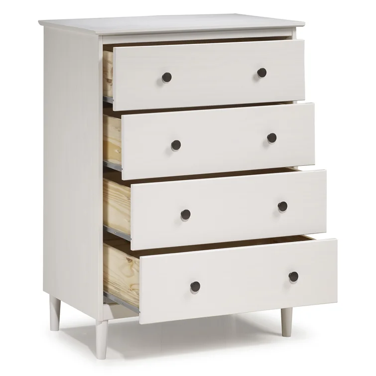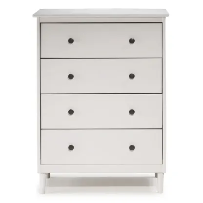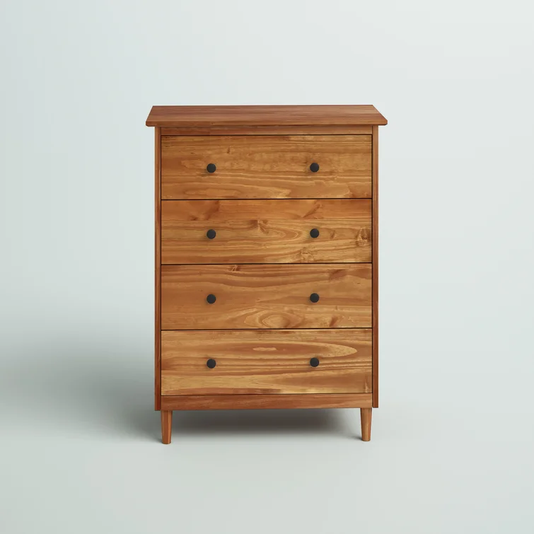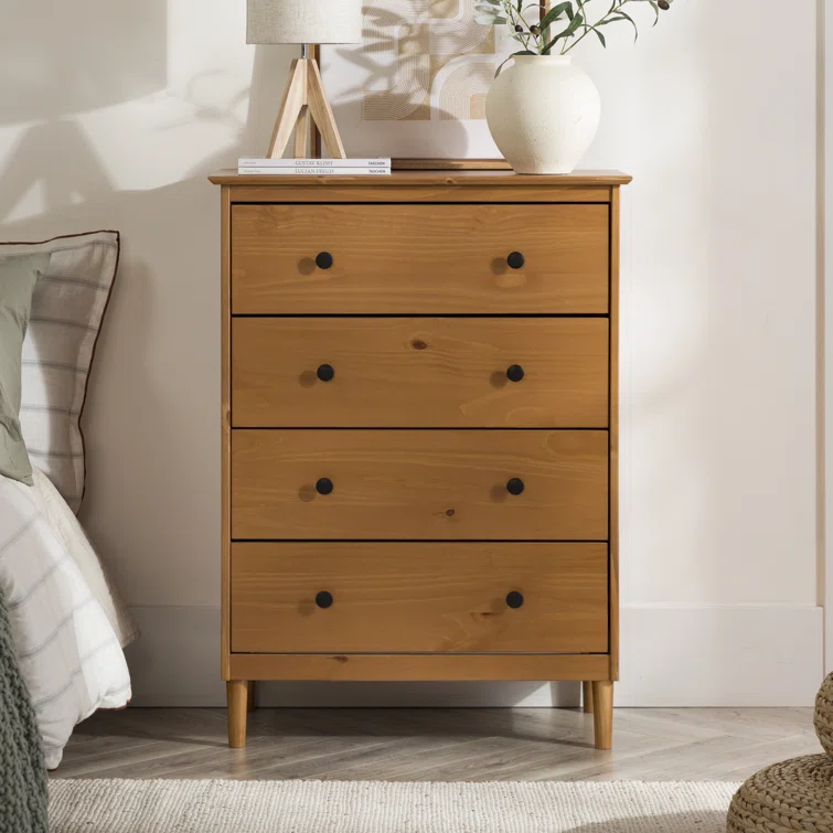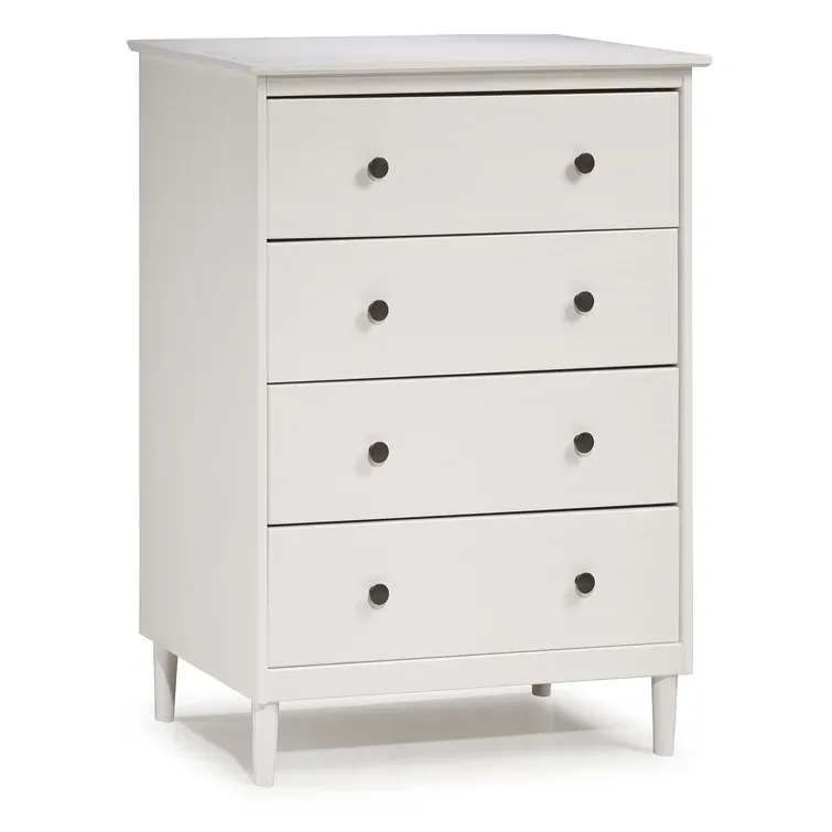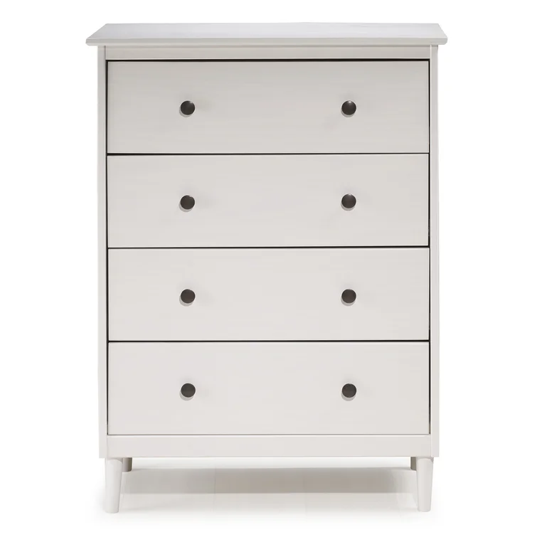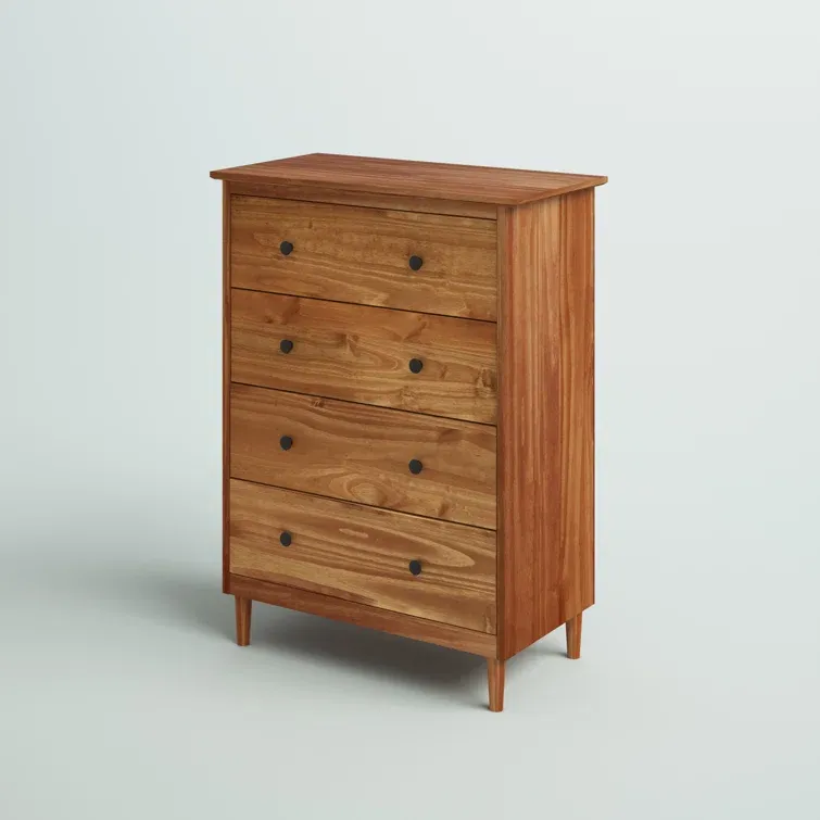 This 4-drawer chest rounds out your bedroom with its mid-century modern design and traditional style. The boxy frame is crafted from solid pine and engineered wood with a rustic and weathered finish, and it rests on tapered dowel legs. The four drawers with black metal handles give you lots of room to organize your wardrobe, linens, and delicates. And safety stops on the drawers keep fingers from getting pinched. This dresser has a finished back, so it's ready to be placed just about anywhere. A wall anchor is included for extra stability.