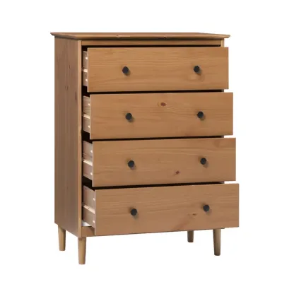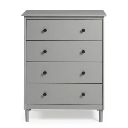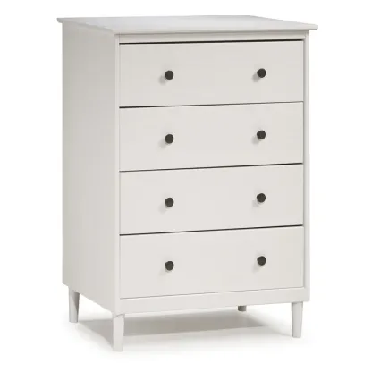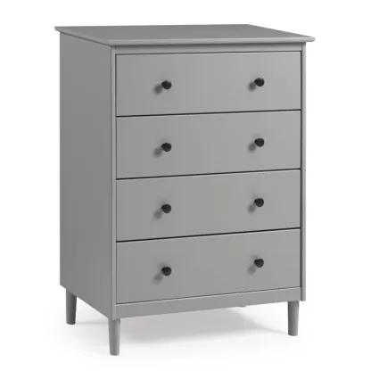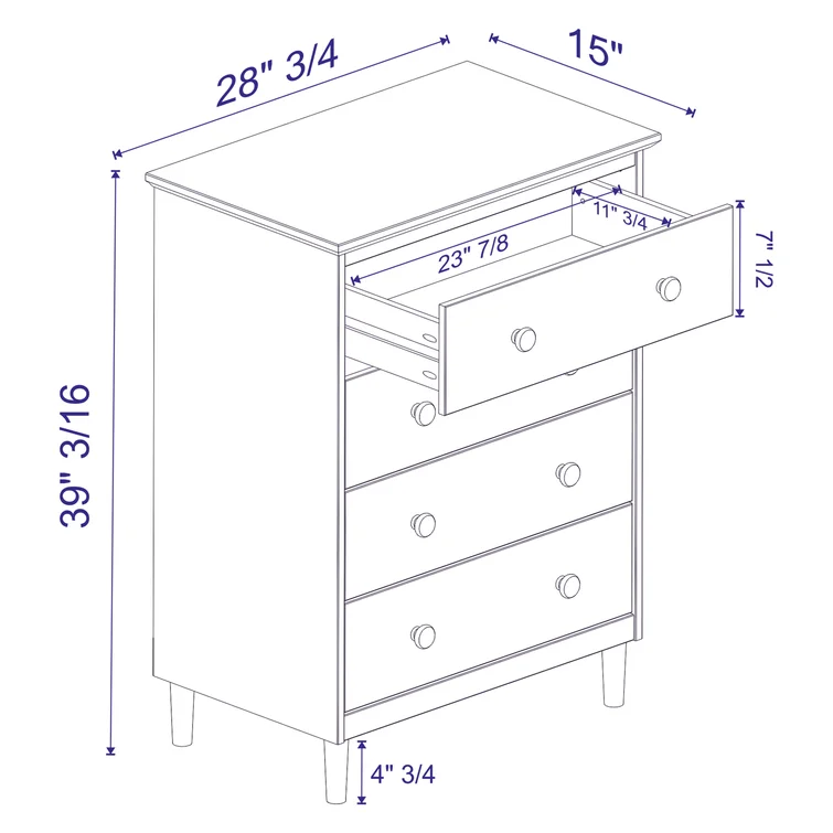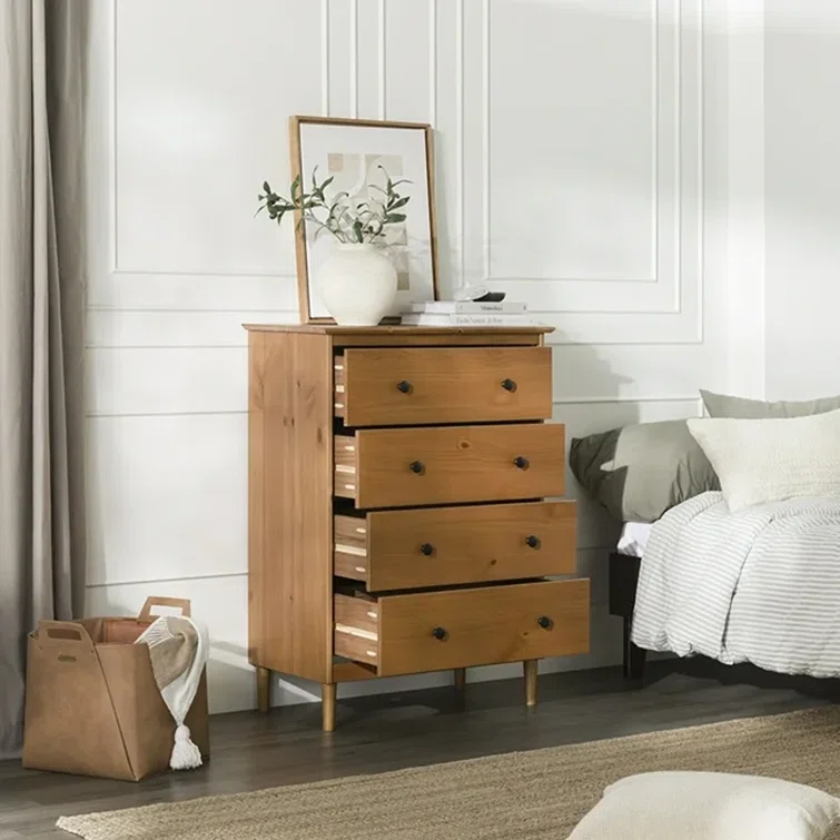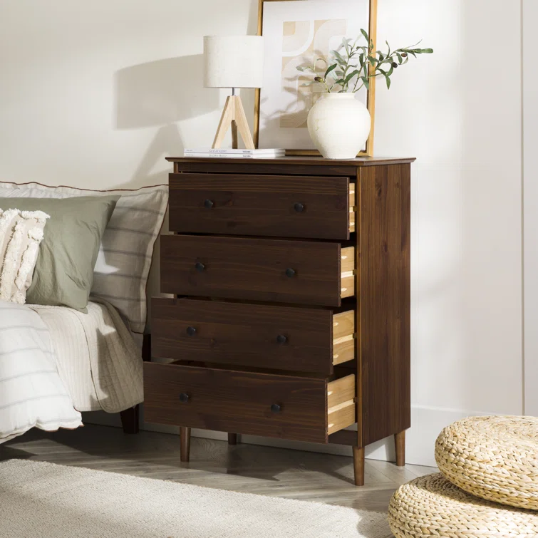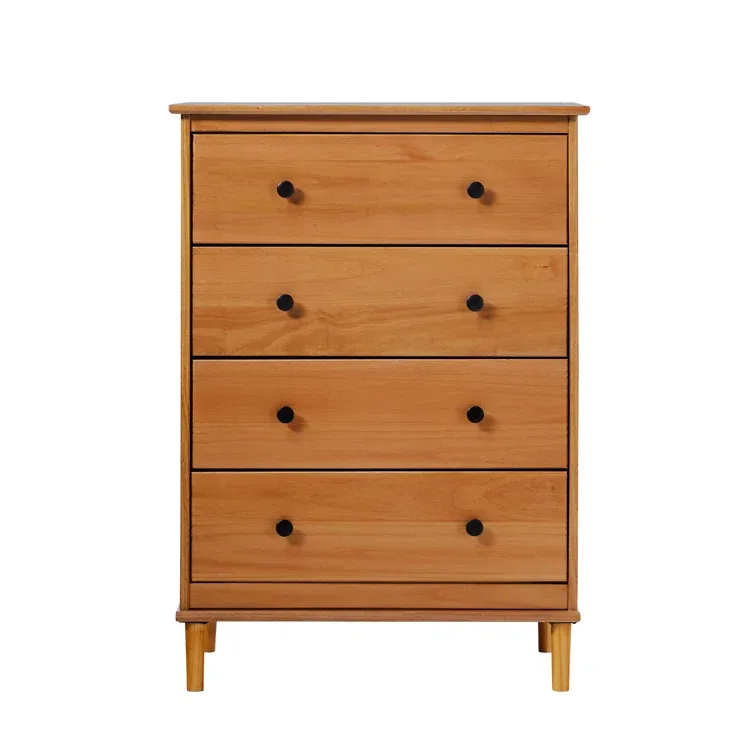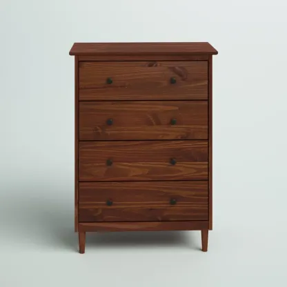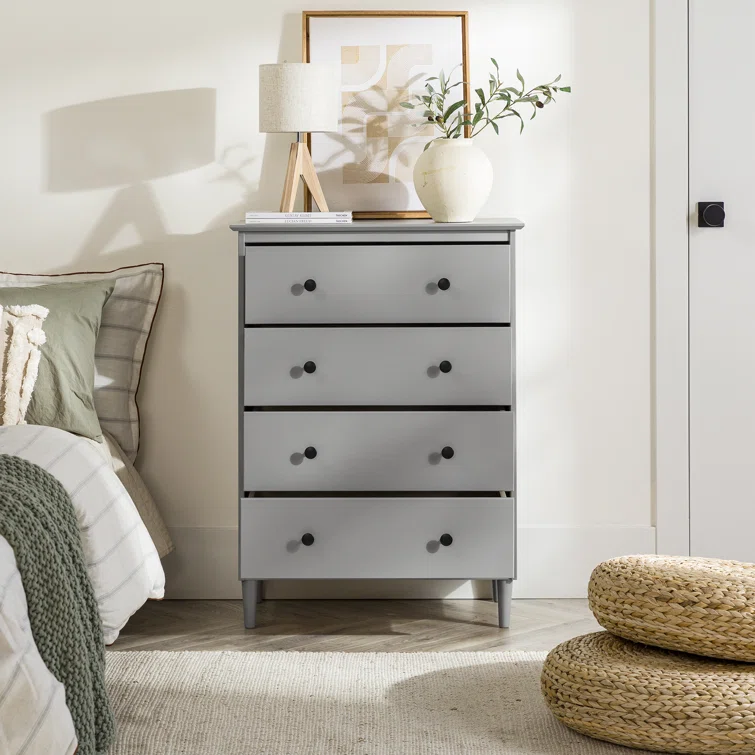This 4-drawer chest rounds out your bedroom with its mid-century modern design and traditional style. The boxy frame is crafted from solid pine and engineered wood with a rustic and weathered finish, and it rests on tapered dowel legs. The four drawers with black metal handles give you lots of room to organize your wardrobe, linens, and delicates. And safety stops on the drawers keep fingers from getting pinched. This dresser has a finished back, so it's ready to be placed just about anywhere. A wall anchor is included for extra stability.
