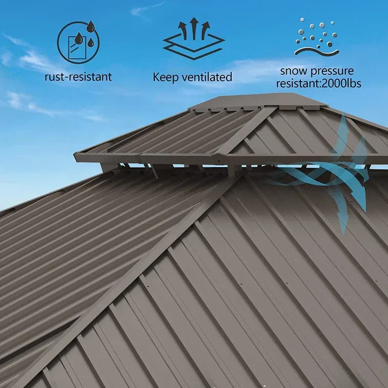 Product Type Patio Gazebo Portable No Footprint Shape Rectangular Frame Material Aluminum Roof Type Hardtop Roof Material Steel Attachment Type Screw On Roof Included Yes Powder Coated Finish Yes Wind Vents Included Yes Tiered Roof Yes Snow Load Capacity 2,500 lb. Anchor / Mounting Kit Included Yes Side Curtains or Panels Included Yes Mesh Screens Included Yes Year-Round Use Yes Weather Resistant Yes UV Resistant Yes Water Resistant Yes Fire Resistant Yes Rust Resistant Yes Mold / Mildew Resistant Yes Door or Opening Yes Imported Yes Permanence Permanent Paintable Yes Durability Mold / Mildew Resistant; Water Resistant; UV Resistant; Fire Resistant; Wind Resistant; Weather Resistant; Rust Resistant Roof Hanging Weight Capacity 15 lb. Wind Rating 46 mph Roof Color Brown Frame Finish Bronze -