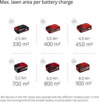The Einhell cordless lawn mower RASARRO is equipped with lawn-friendly, large-area wheels. The 45 litre grass collection box has a fill level indicator. The lawn comb allows near-edge mowing. The RASARRO is recommended for lawns up to 450 m2 �C powered by two Power X-Change 4.0 Ah batteries.