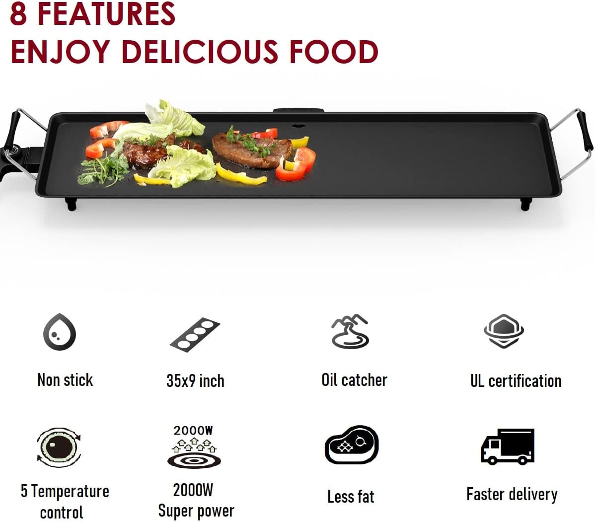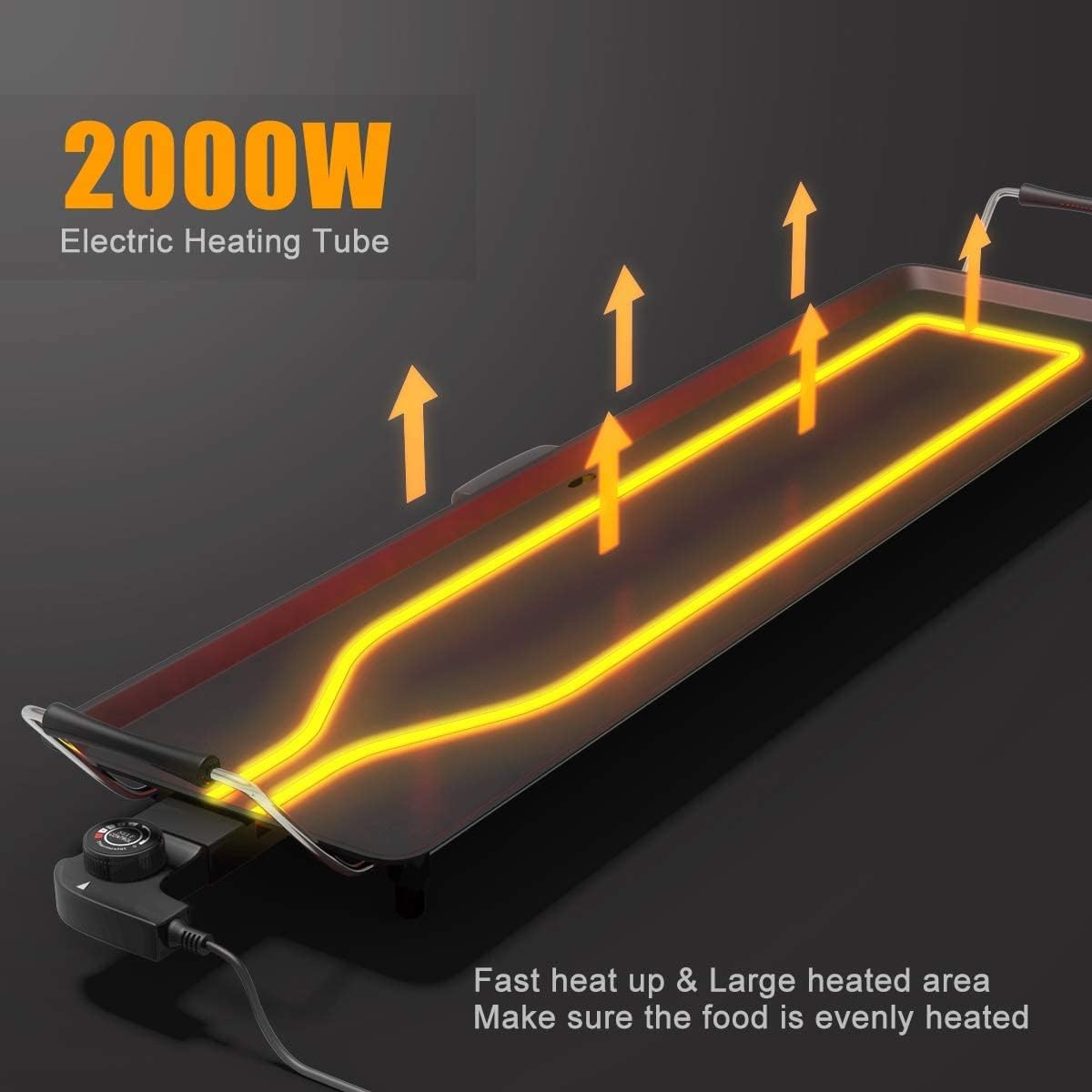 - Powerful Performance & 5 temperature settings: Electric griddle boasts an impressive 2000W power capacity, ensuring quick and efficient cooking. Teppanyaki grill with 5 temperature settings, ranging from 212�?to 464�? you can easily adjust the heat according to their cooking needs.
