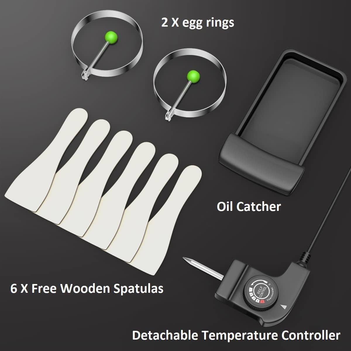 - Large Cooking Surface: The 35 x 9-inch extra-large griddle provides ample space to cook multiple food items simultaneously. Indoor/outdoor table top grill comes with 6 wooden spatulas and 2 non-stick egg rings, allowing multiple users to enjoy cooking together.