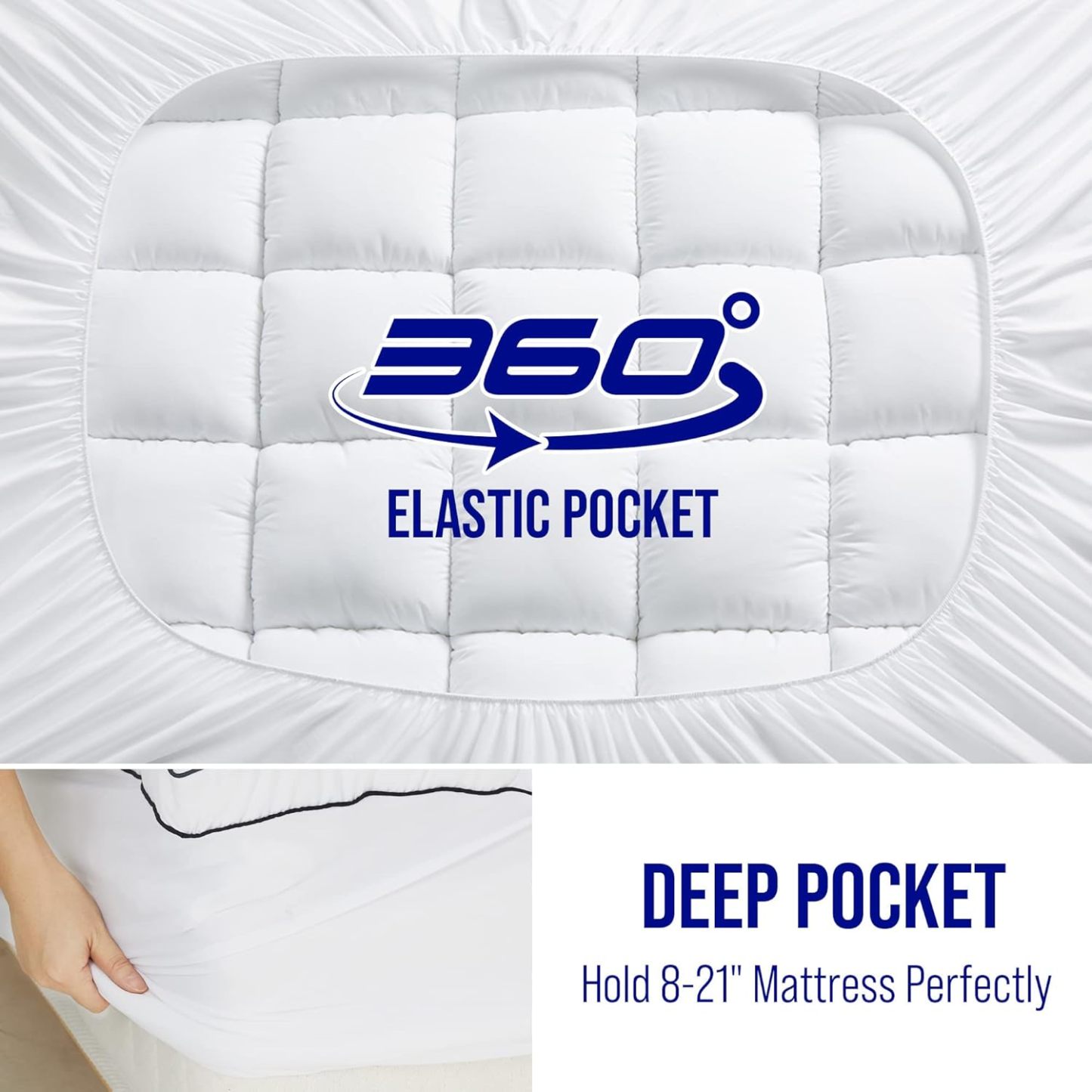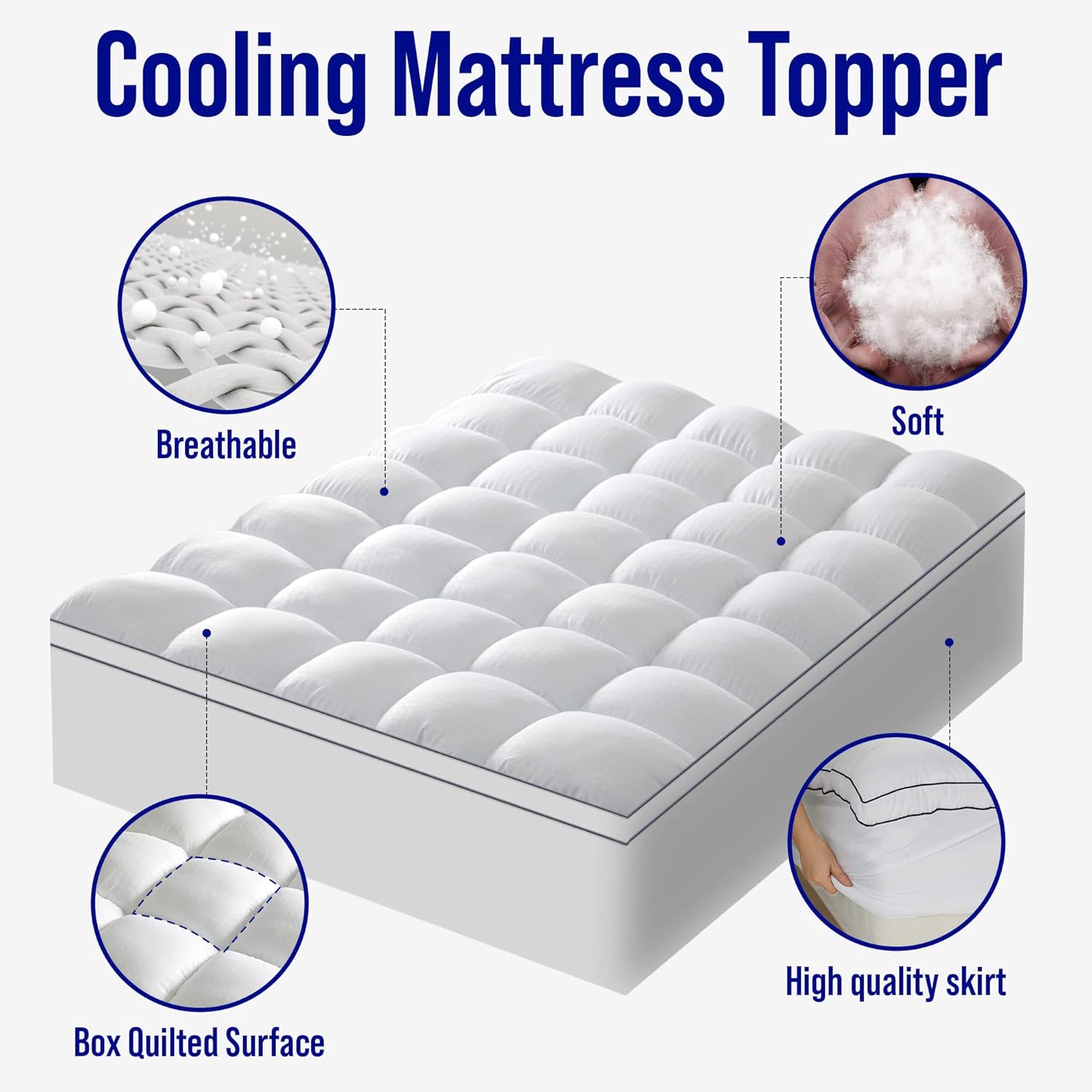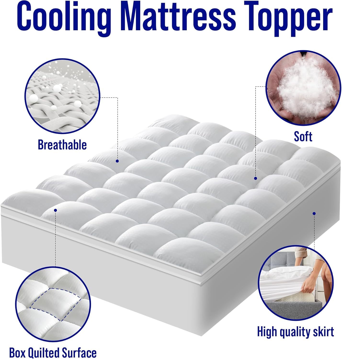 Extra ThickMattress topper uses quilted snow down alternative filling which can make you feel soft and stress-relieving support. | 3D Hollow Fiber StructureThe cloud-like surface with 3D&7D Fiber made Three Dimensional Structure that make the air circulate. | Deep PocketStretchable knitted skirt design is deep enough to fit securely mattress depths 8"-21" and gives protection for the top and sides and new life to your mattress. | Machine WashableMachine wash separately in cold water. Tumble dry on low heat or line dry. Do not bleach. Wash them regularly to keep you healthier. |