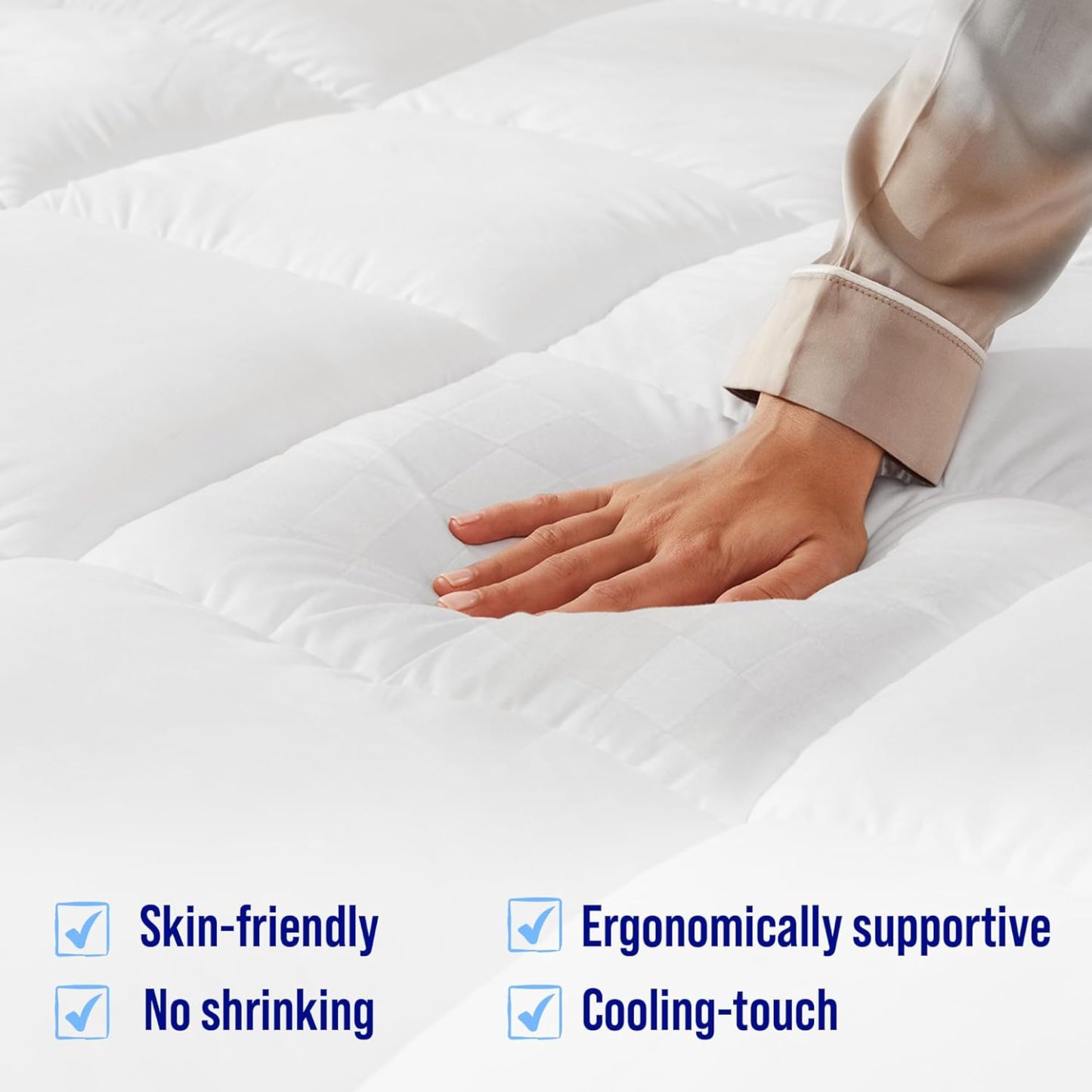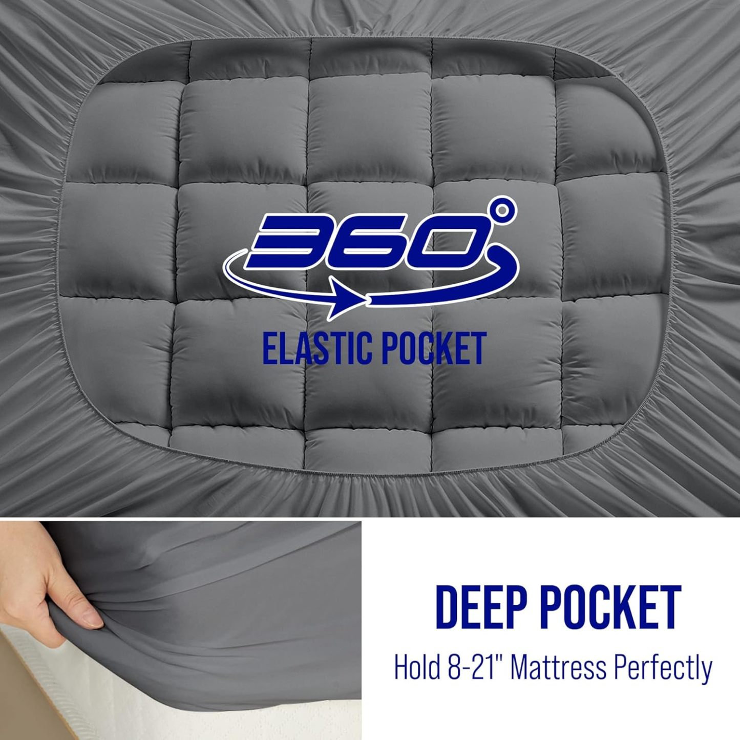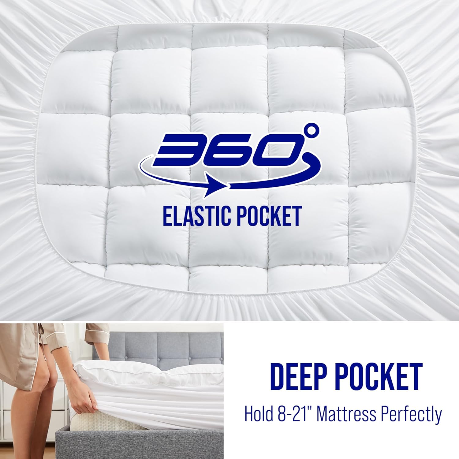 Extra ThickMattress topper uses quilted snow down alternative filling which can make you feel soft and stress-relieving support. | 3D Hollow Fiber StructureThe cloud-like surface with 3D&7D Fiber made Three Dimensional Structure that make the air circulate. | Deep PocketStretchable knitted skirt design is deep enough to fit securely mattress depths 8"-21" and gives protection for the top and sides and new life to your mattress. | Machine WashableMachine wash separately in cold water. Tumble dry on low heat or line dry. Do not bleach. Wash them regularly to keep you healthier. |