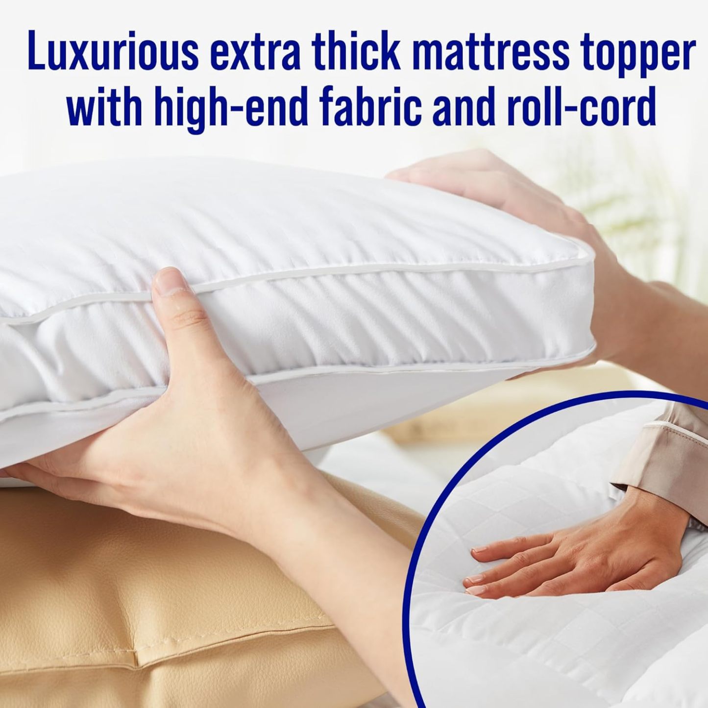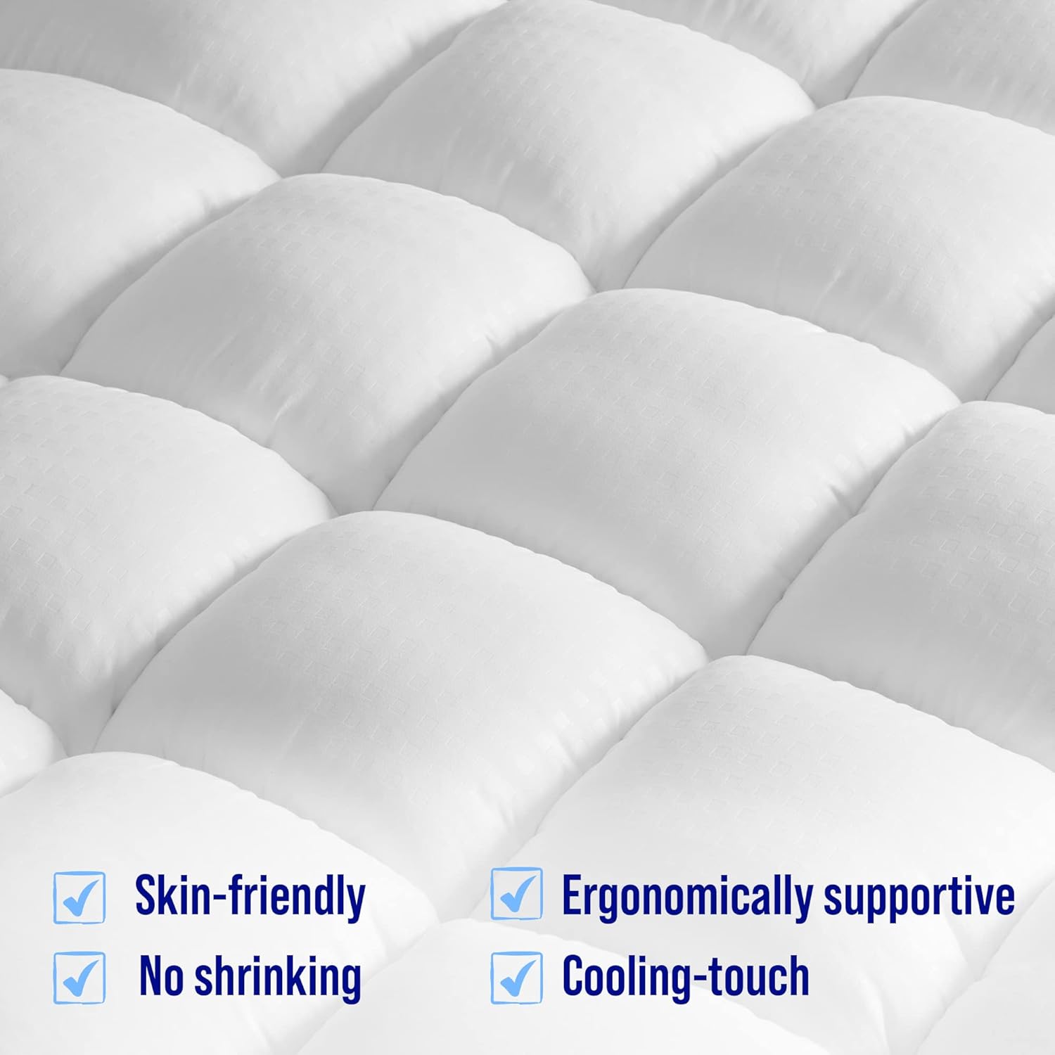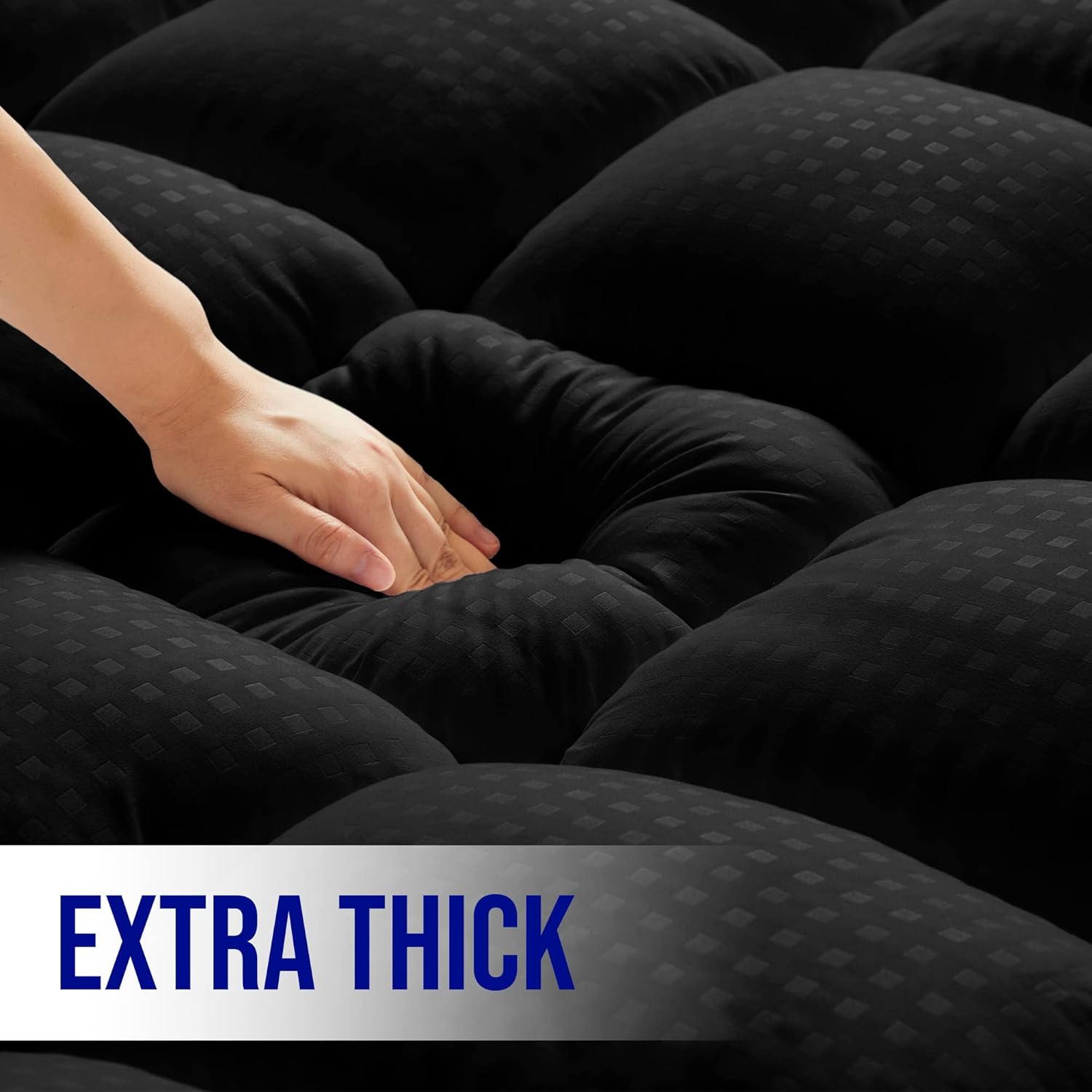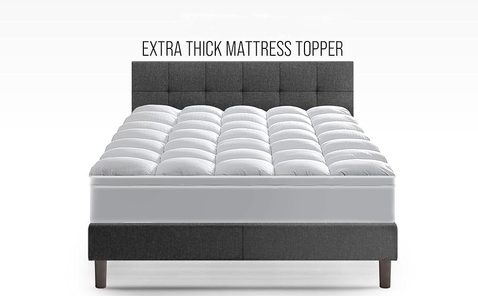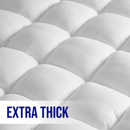 - Luxury Extra Thick Mattress Topper - Mattress topper uses 3D snow down alternative overfilling that can make you feel soft & fluffy and get stress-relieving support. Square jacquard surface with double border pillow top construction can make your bedroom no longer monotonous