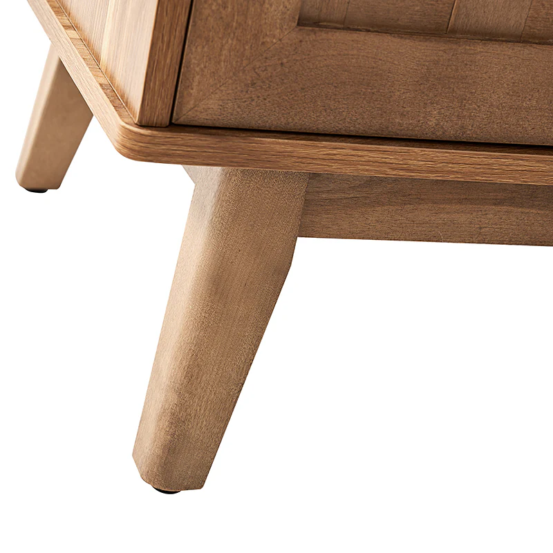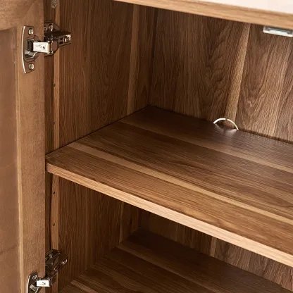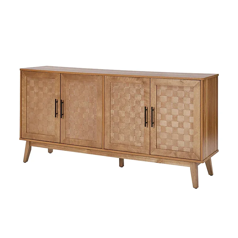 The modern sideboard seamlessly blends functionality with aesthetic appeal. Crafted with exquisite maple veneer, the intricately handwoven cabinet doors showcase the luxurious quality of maple wood. Supported by solid wood legs, the piece exudes durability and sophistication. The sleek metal linear handles complement the design, adding a contemporary touch. The sideboard features adjustable shelves, offering versatile storage options for various items. A multimedia hole discreetly accommodates electronic devices, ensuring seamless integration of technology. With the combination of materials and thoughtful details like adjustable legs, this sideboard is a statement of modern design, embodying both style and practicality.
