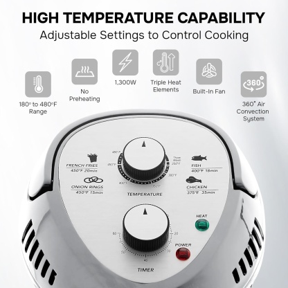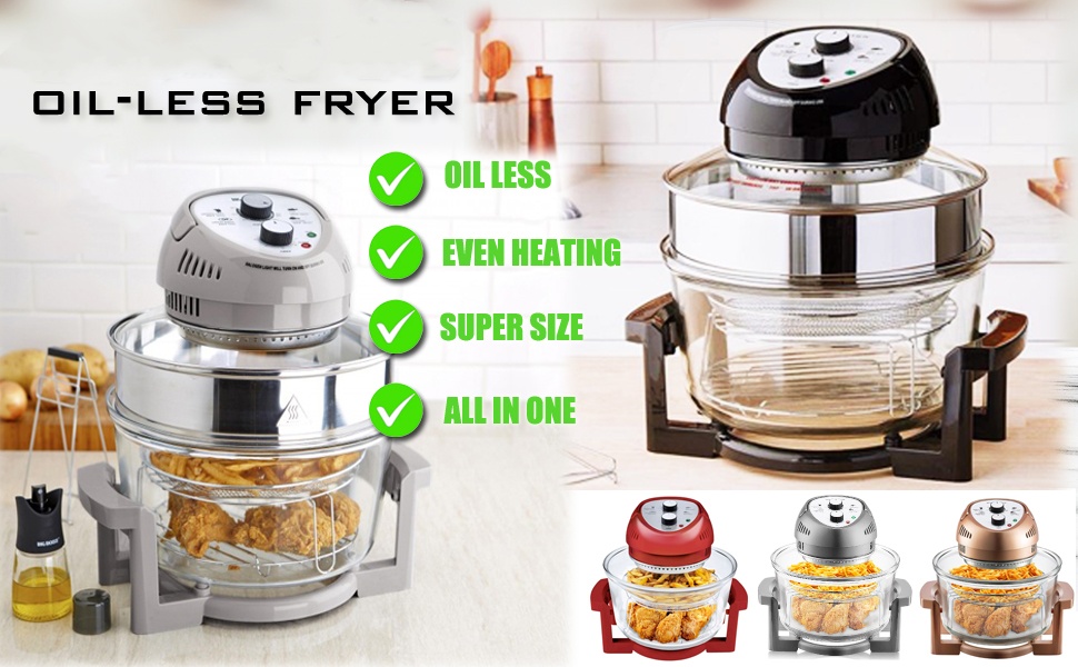 - ALL-IN-1 MACHINE: Oil-Less Air Fryer is not only an air fryer. With wide temperature range from 180�?to 400�? this large air fryer allows you to air fry, bake, grill, roast, toast.