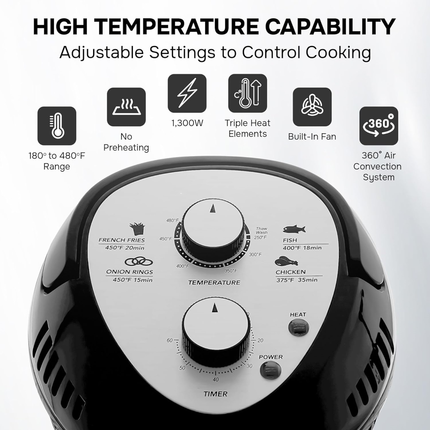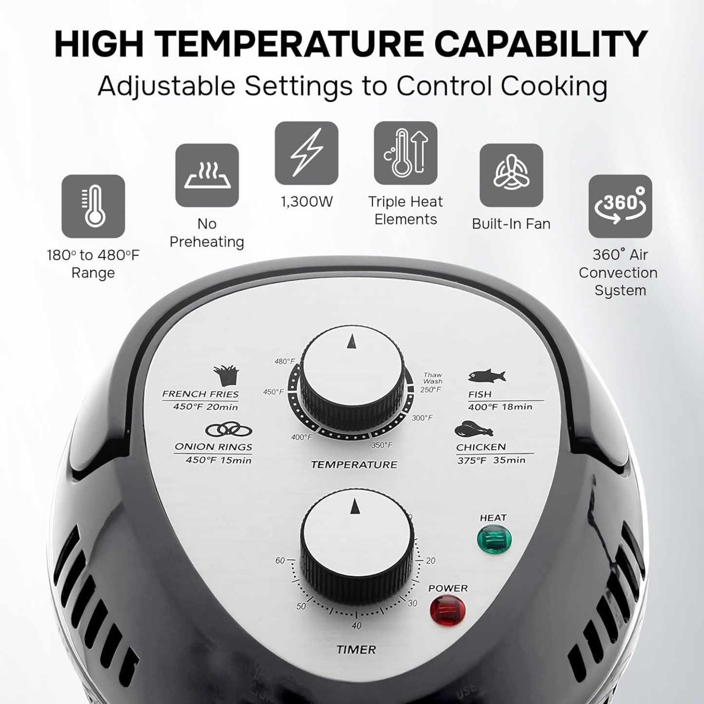 - 360 EVEN & POWERFUL HEATING: Oil-Less Air Fryer Circulates super-hot air around food to cook your meals faster thanks to the 1300W powerful built-in fan and 360° air convection system.