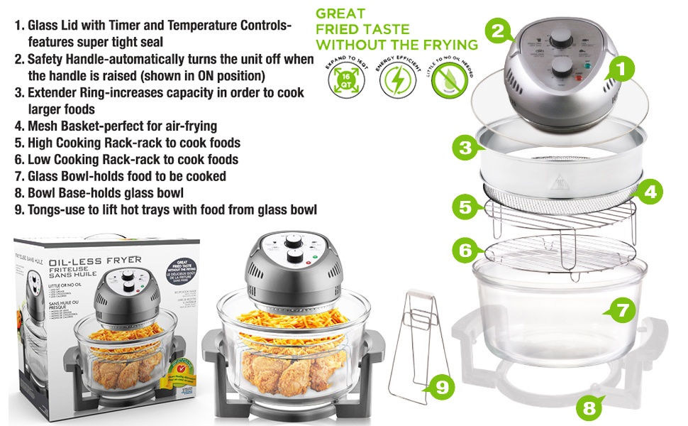 - OIL LESS & HEALTHIER CHOICE: Oil-Less Air Fryer fry with little to no oil and still keep the deep-fried crispy texture of food; frying bowl and pan combo separates food in the basket from fat and oil dripping down the pan.