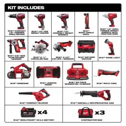 Also Includes: M18 6 1/2 in. Circular Saw (2630-20), M18 Cut-off/Grinder (2680-20), M18 2-Gallon Wet/Dry Vac (0880-20), M18 Multi-Tool (2626-20), M18 Compact Blower (0884-20), M18 LED Work Light (2735-20), M18 Jobsite Radio (2890-20), M18 Six Pack Sequential Charger (48-59-1806), and (4) M18 REDLITHIUM XC 3.0 Extended Capacity Packs (48-11-1828).