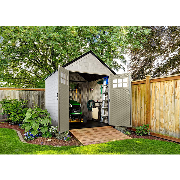 - STORAGE: Rubbermaid outdoor storage shed features 332 cubic feet, 2 windows, that can fit a riding mower and many other outdoor tools
