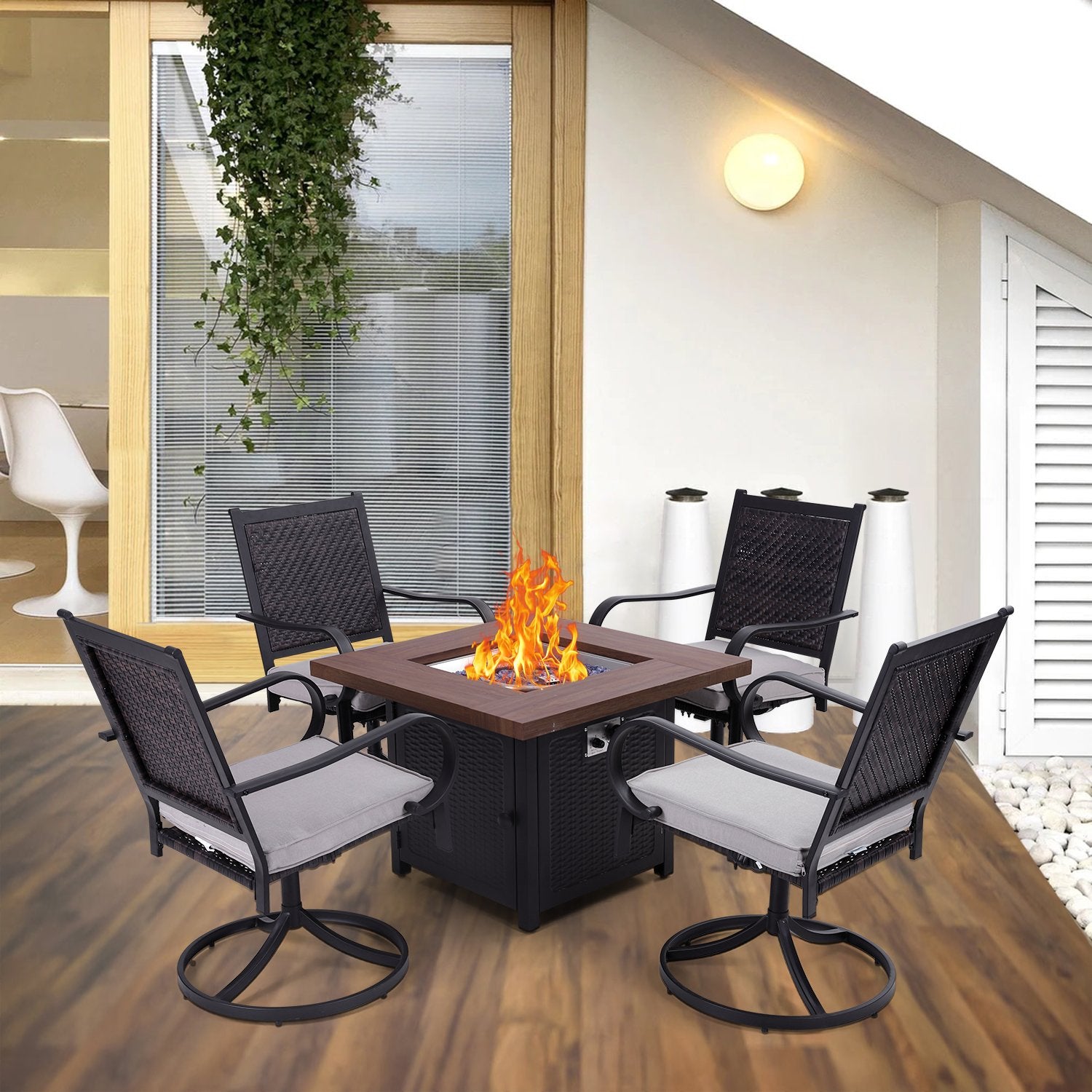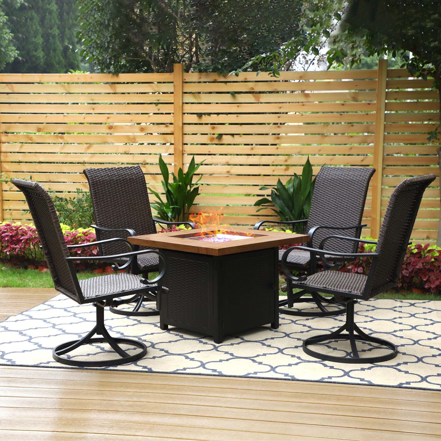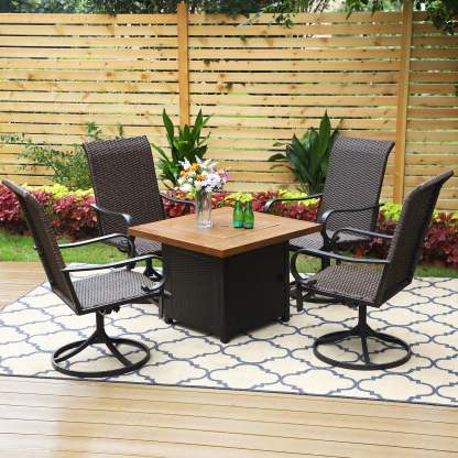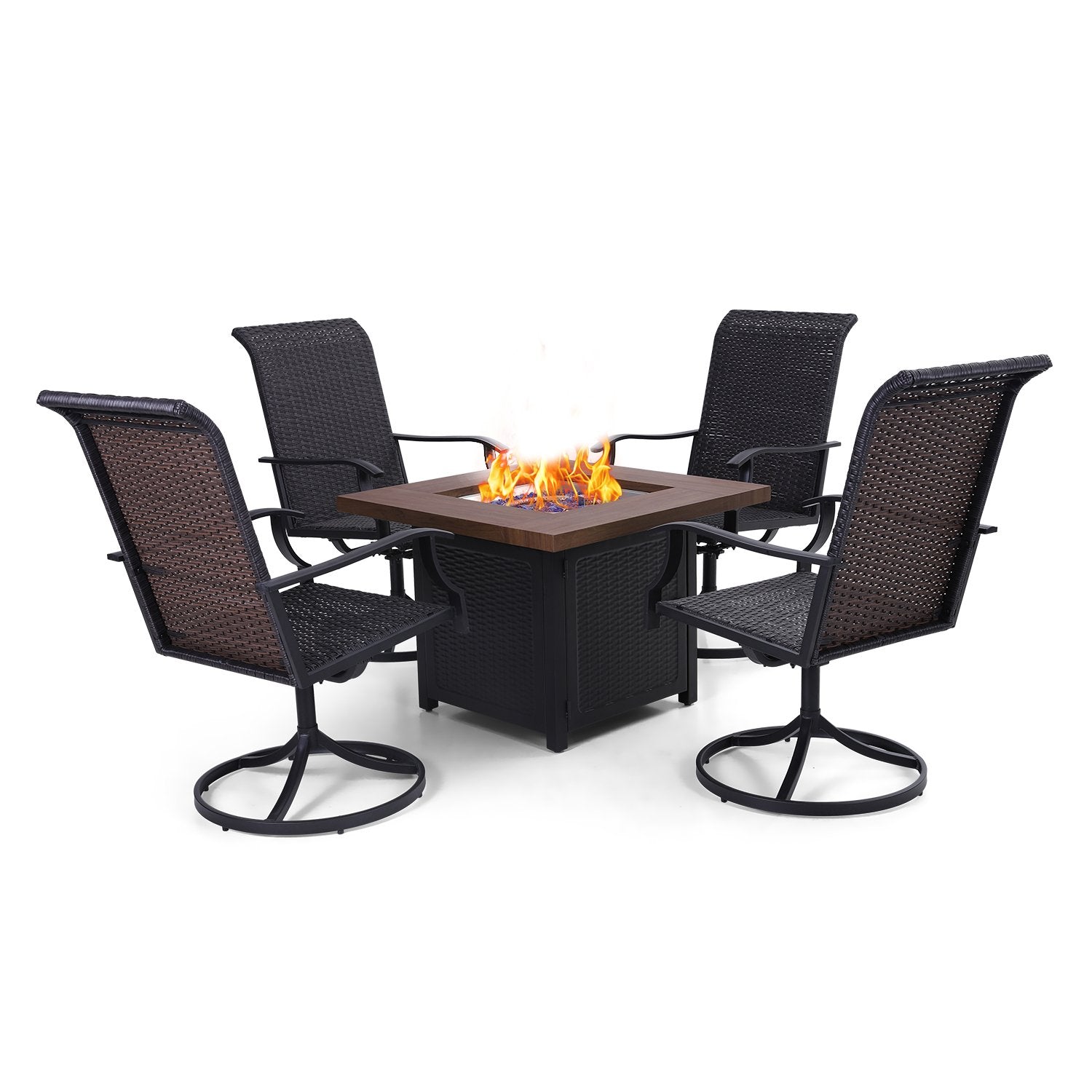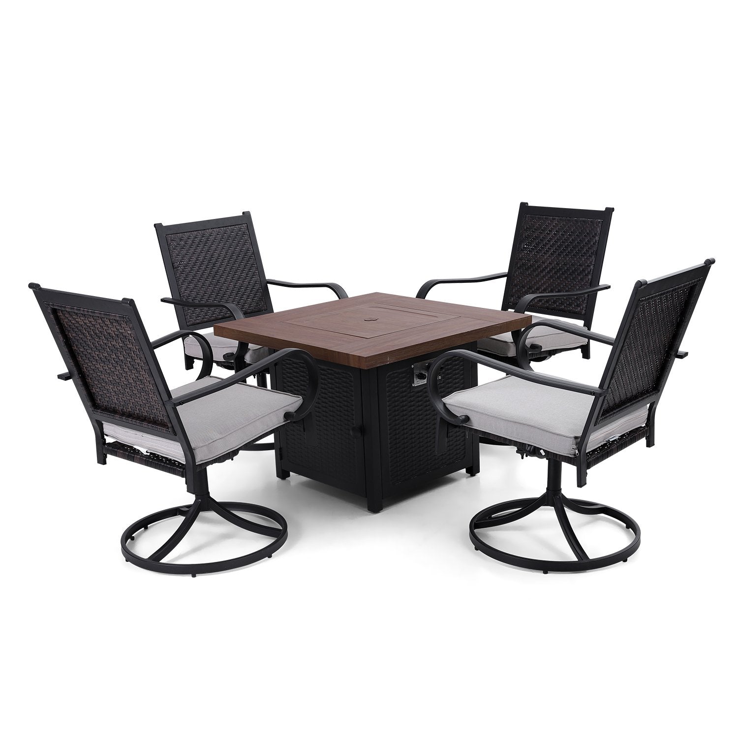 5-Piece Patio Outdoor Fire Pit Set with Rattan Swivel Chairs & Wood-look Square Steel Gas Fire Pit Table