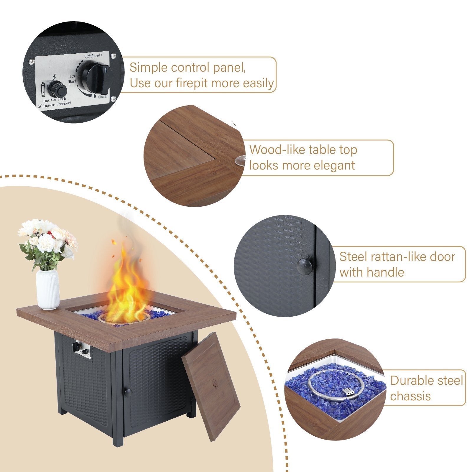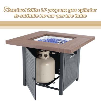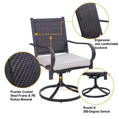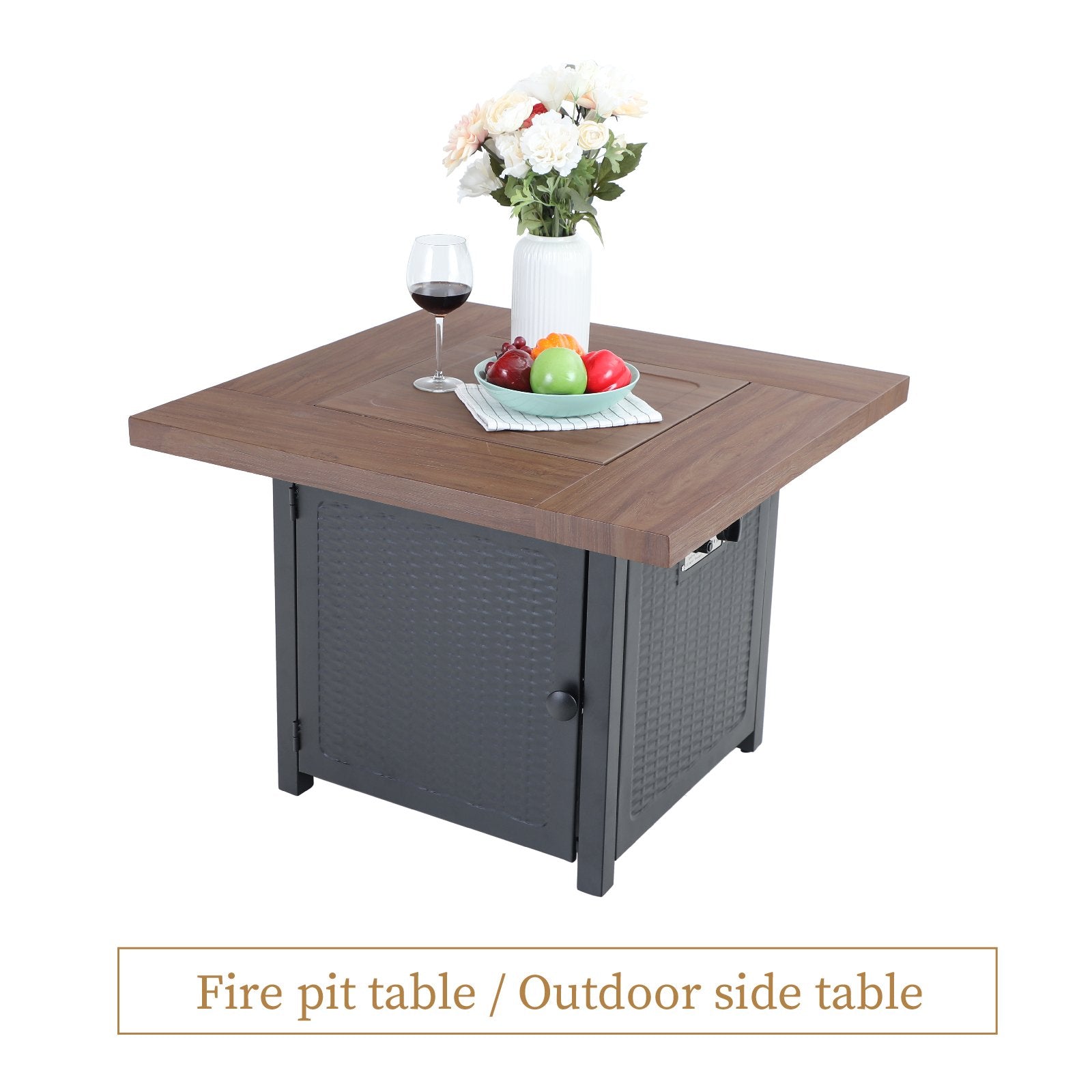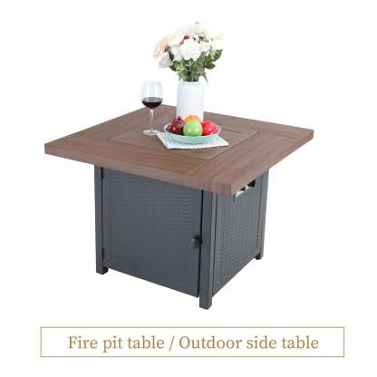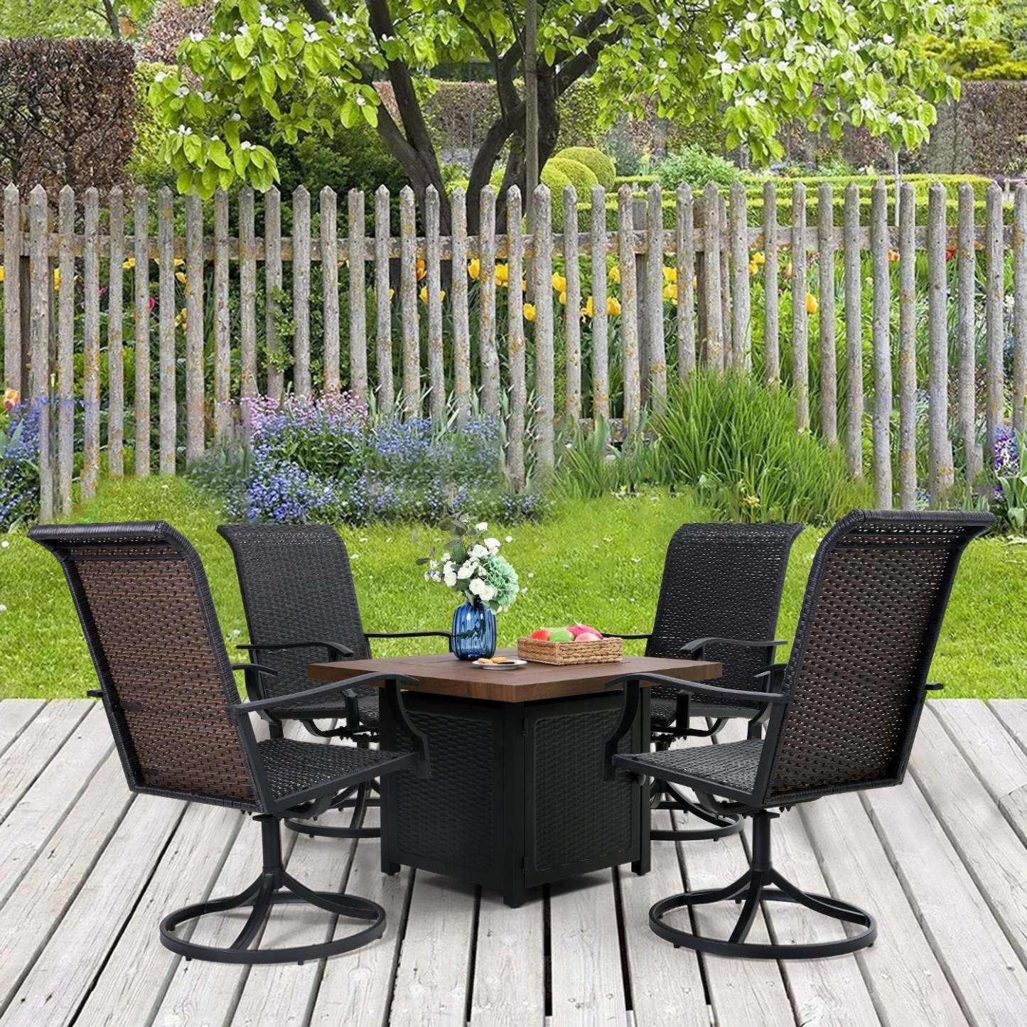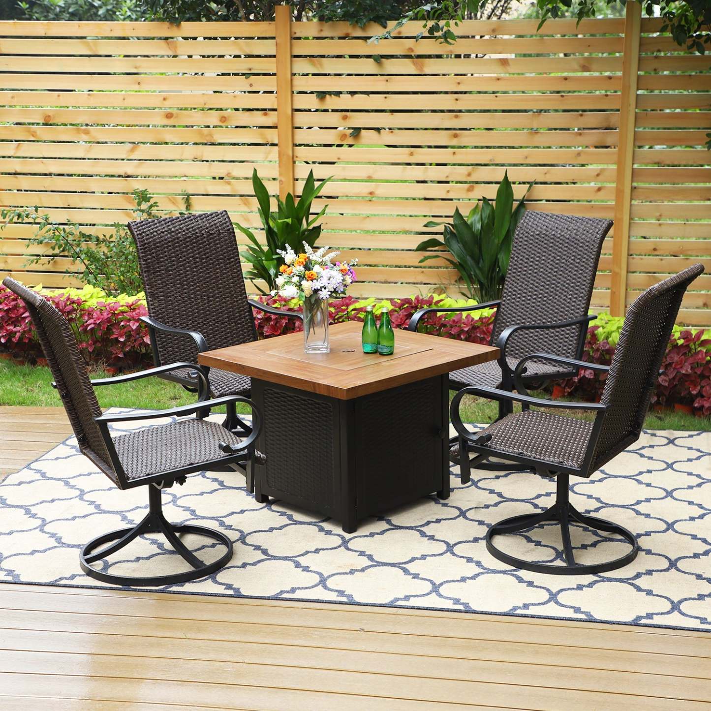 5-Piece Patio Outdoor Fire Pit Set with Rattan Swivel Chairs & Wood-look Square Steel Gas Fire Pit Table