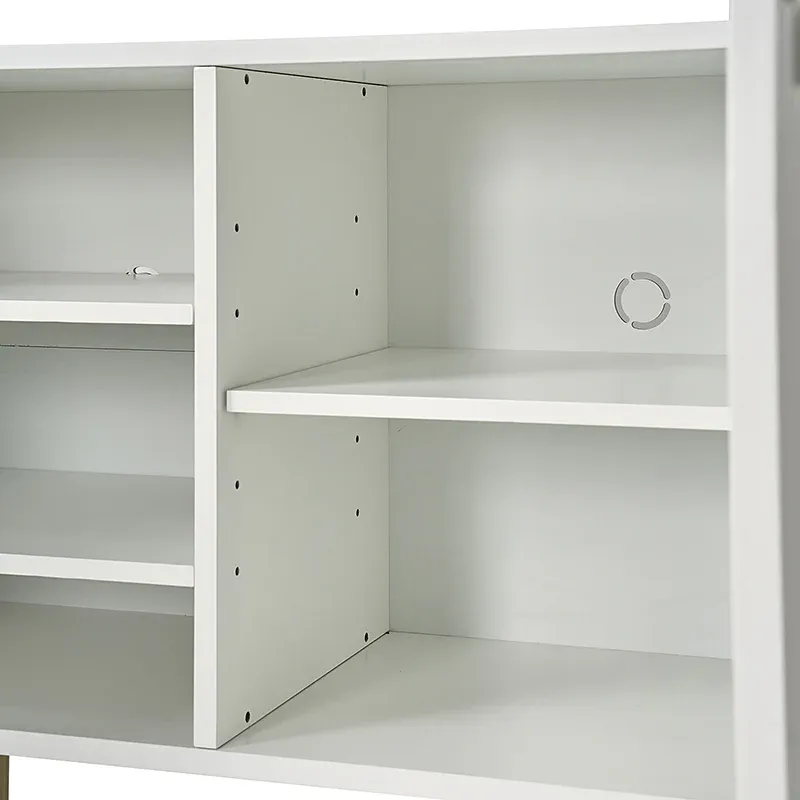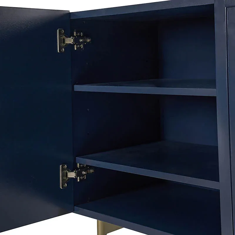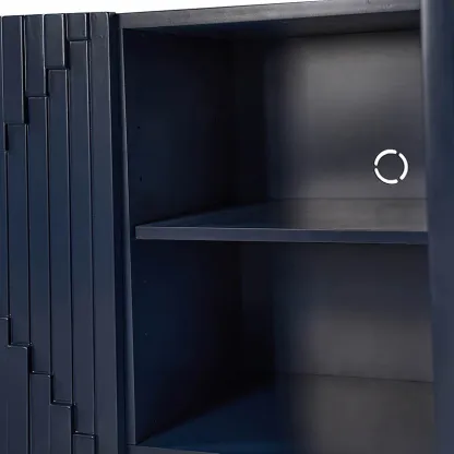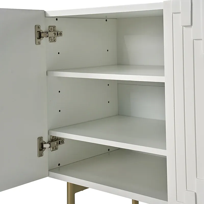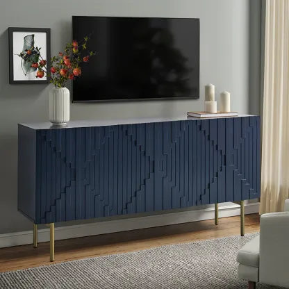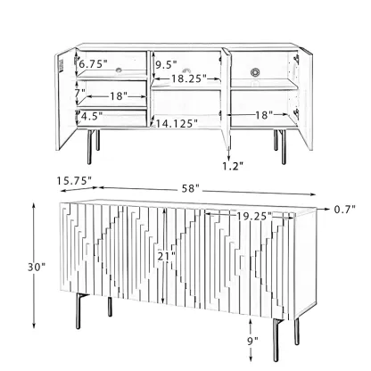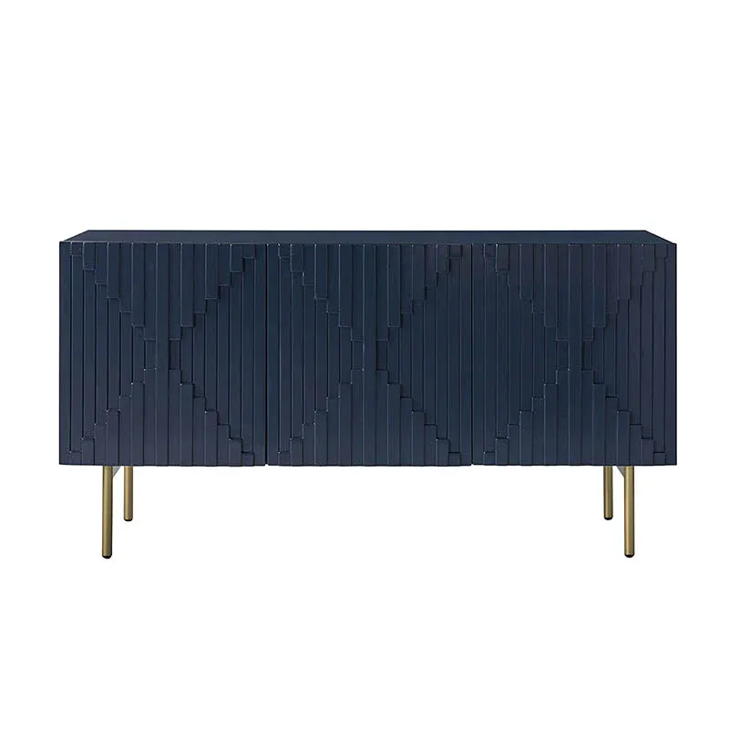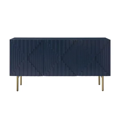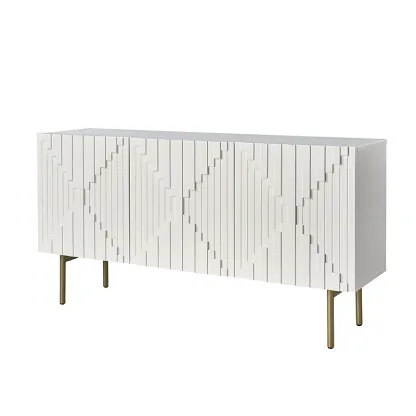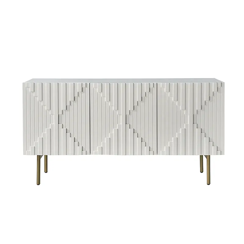 This boho sideboard adds storage and texture to your living area, dining room or hallway. Crafted with modern sensibilities in mind, it boasts elegant metal legs that add a touch of sophistication. Functionality meets style, as ample storage space hides behind the intricate three-dimensional door panels, adorned with an eye-catching geometric ascending staircase pattern that captivates the eye. The adjustable feet ensure stability on different surfaces, while the thoughtful inclusion of three cable management holes anticipates your contemporary connectivity needs. Transform your living experience and declutter your space with this exquisite sideboard cabinet that effortlessly marries aesthetics with utility.