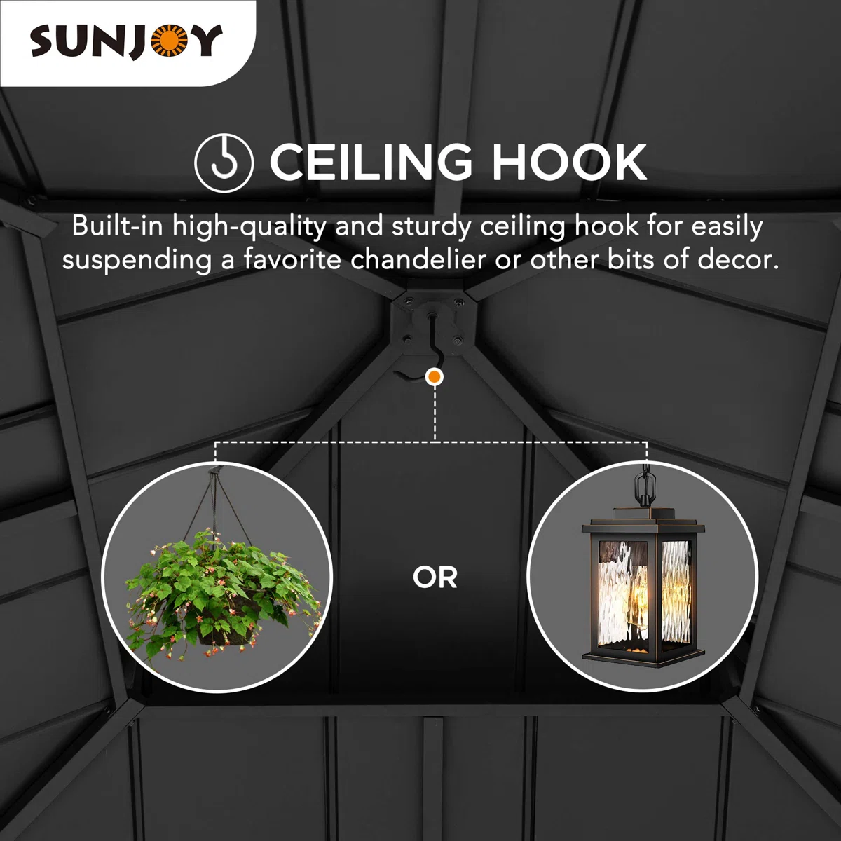 Expand your living space by bringing the indoors outside and creating your end-of-the-day oasis that��s the perfect spot for entertaining family and friends. This 11x11 wooden gazebo by the world��s leading ready-to-assemble outdoor structure maker, Sunjoy, creates the perfect outdoor setting for any time of the year. Spend all four seasons enjoying a covered spot outdoors under the chestnut-color cedar wood frame with a brown sturdy powder-coated steel rooftop that will stand the test of time. The 2-tier roof provides just the right amount of airflow while keeping occasional inclement weather at bay. Set the mood by suspending a chandelier from the incorporated ceiling hook for functional light and high design. With straightforward, easy-to-follow assembly instructions you��ll be relaxing with your beverage of choice in your favorite new outdoor living space for years to come.