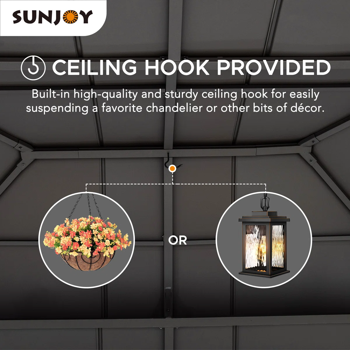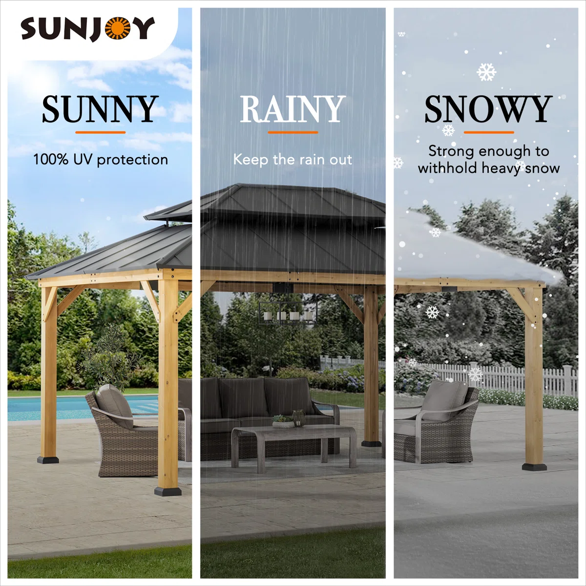 Expand your living space by bringing the indoors outside and create an end-of-the-day oasis that��s an ideal spot for entertaining family and friends. This 12 ft. x 16 ft. wood gazebo from the world��s leading ready-to-assemble outdoor structure maker, Sunjoy, creates the perfect outdoor setting for a gathering any time of the year. Spend all four seasons enjoying your covered area outdoors under a cedar wood frame gazebo with a sturdy powder-coated steel rooftop that will stand the test of time. The 2-tier roof provides just the right amount of airflow while simultaneously keeping occasional inclement weather at bay. Set the mood by suspending a chandelier from the incorporated ceiling hook for functional light and a touch of elegant design. With straightforward, easy-to-follow assembly instructions you��ll soon be relaxing in your favorite new outdoor living space, and for years to come.