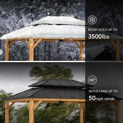 - Sturdy & Stability: This 12x16 ft. large-size hardtop gazebo is constructed of a durable steel 2-tier roof and premium wood frame, which is designed to provide shade from the heat and keep the water out.