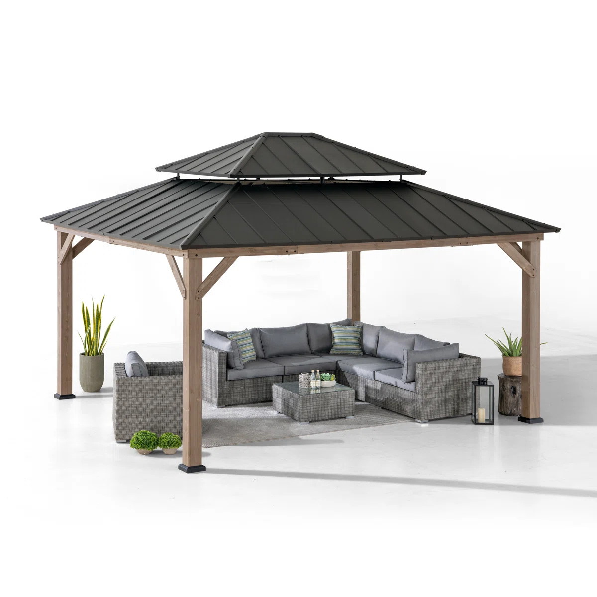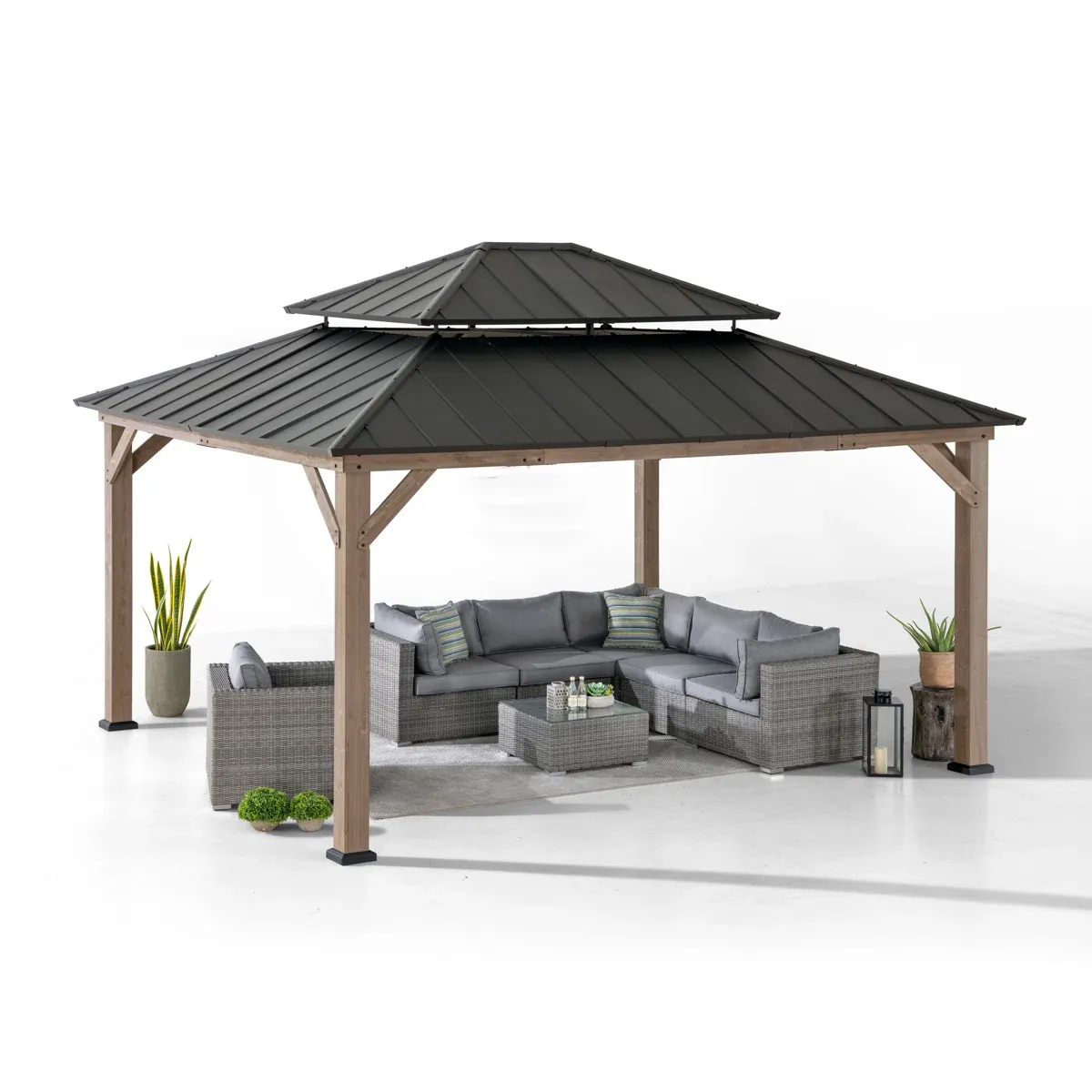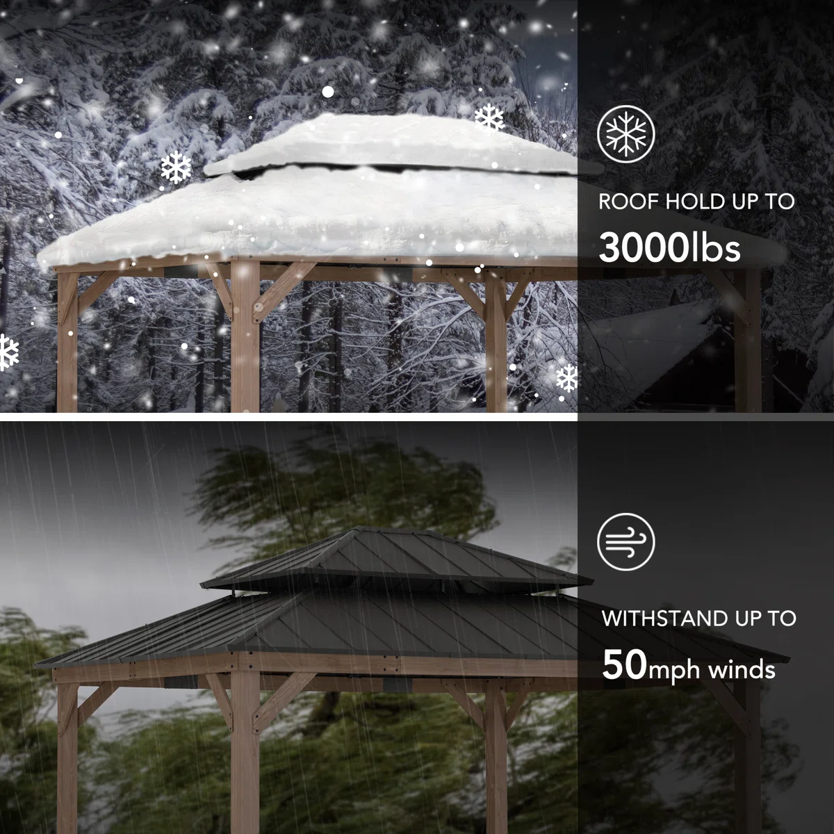 Product Type Patio Gazebo Portable No Footprint Shape Rectangular Frame Material Cedar Wood Roof Type Cedar Wood Roof Material Steel Roof Included Yes Tiered Roof Yes Snow Load Capacity 3,000 lb. Wood Species Cedar Year-Round Use No Weather Resistant Yes UV Resistant Yes Water Resistant Yes Imported Yes Paintable Yes Durability Water Resistant, UV Resistant, Weather Resistant Wind Rating 50 mph Roof Color Gray/Brown