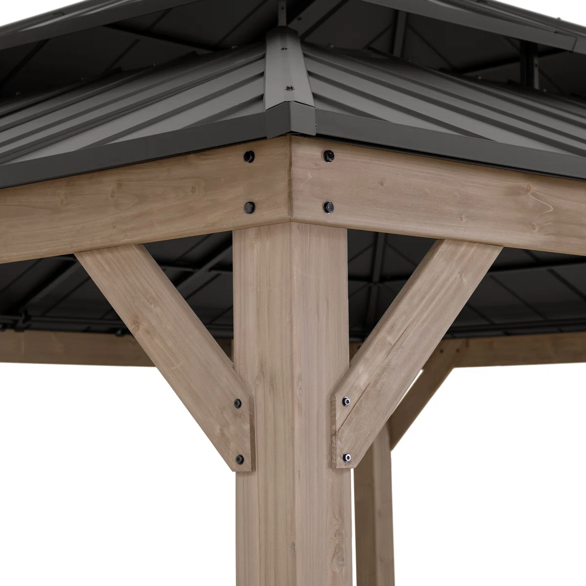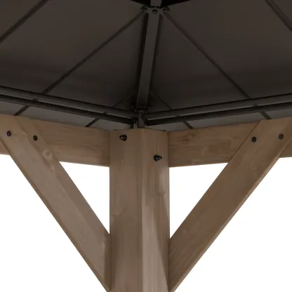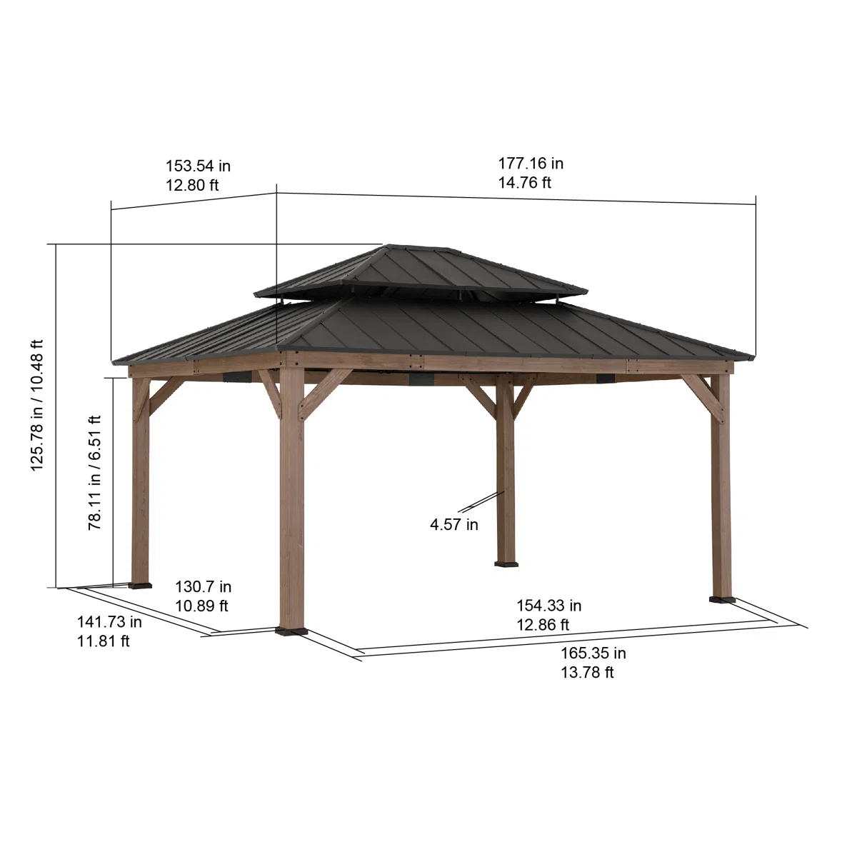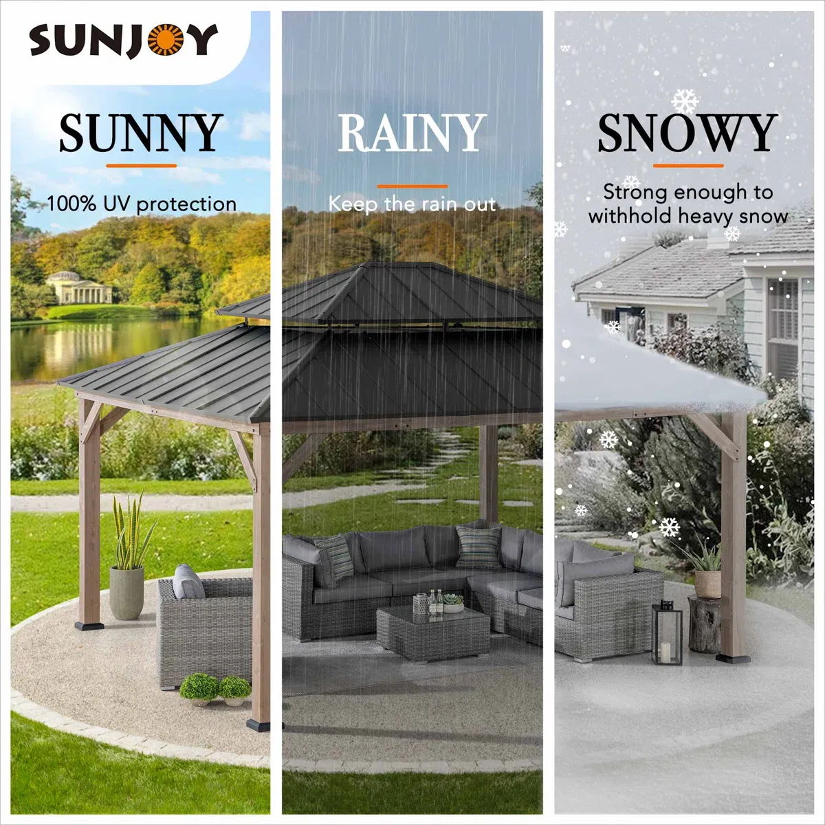Product Type Patio Gazebo Portable No Footprint Shape Rectangular Frame Material Cedar Wood Roof Type Cedar Wood Roof Material Steel Roof Included Yes Tiered Roof Yes Snow Load Capacity 3,000 lb. Wood Species Cedar Year-Round Use No Weather Resistant Yes UV Resistant Yes Water Resistant Yes Imported Yes Paintable Yes Durability Water Resistant, UV Resistant, Weather Resistant Wind Rating 50 mph Roof Color Gray/Brown