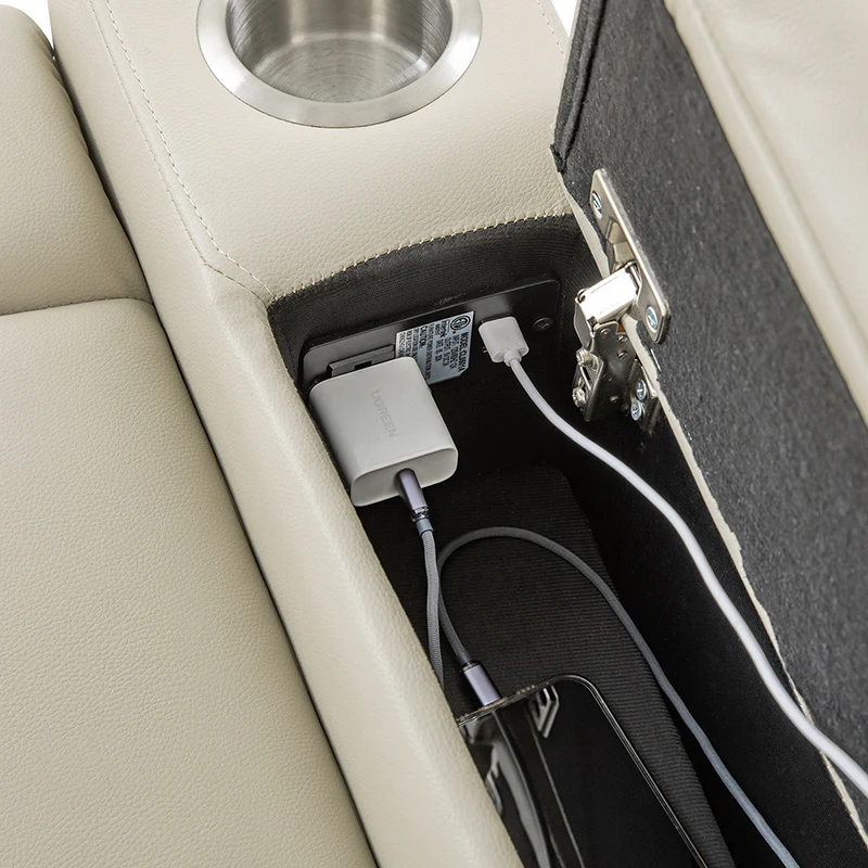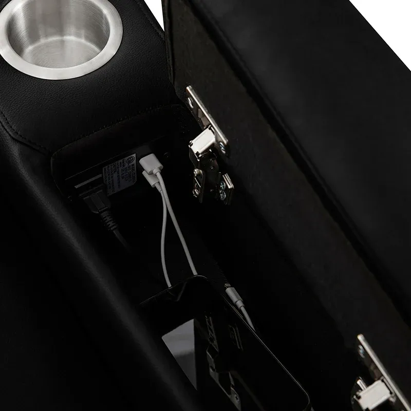 Practical features include two cup holders for convenient access to beverages, armrest storage with built-in USB and type-C ports for charging electronic devices, and ample space for storing a small blanket. Side pockets provide additional storage options. The extended footrest is designed to reduce heel pressure, accommodating even users taller than 6 feet. The hand controller, featuring a hanging strap, ensures easy access.